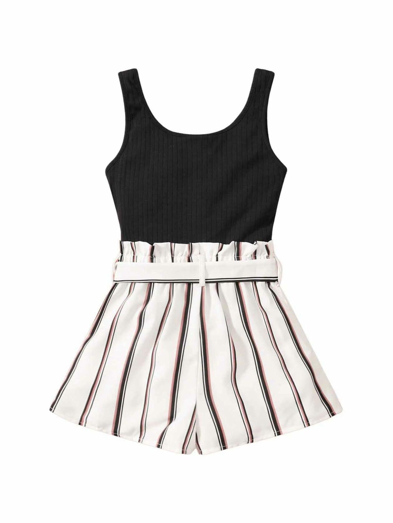 Girl's Sleeveless Notch Neck Belted Romper Striped Rib Knit Black White Size 8Y