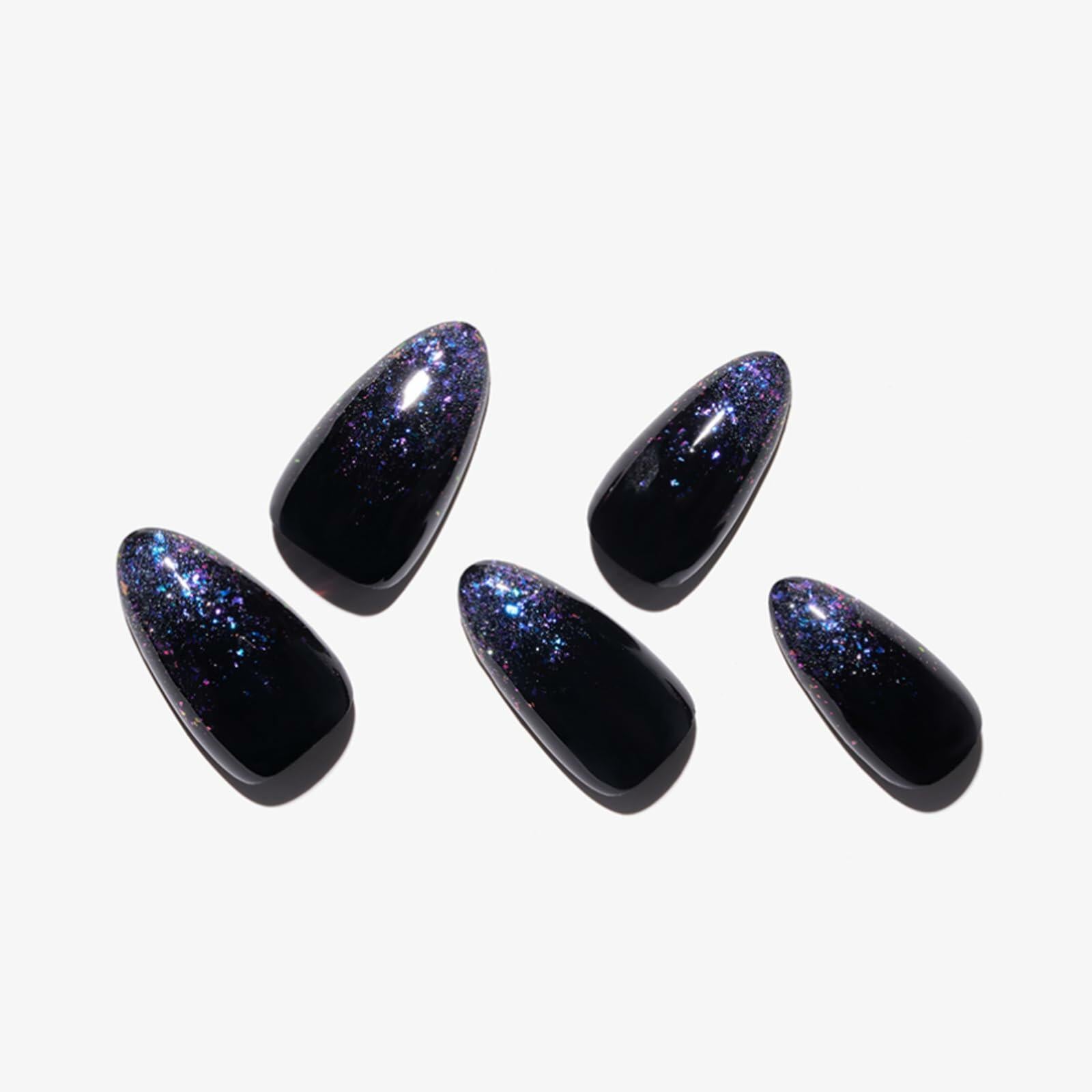 GLAMERMAID Press On Nails Medium Almond Black Glitter French Tips Set
