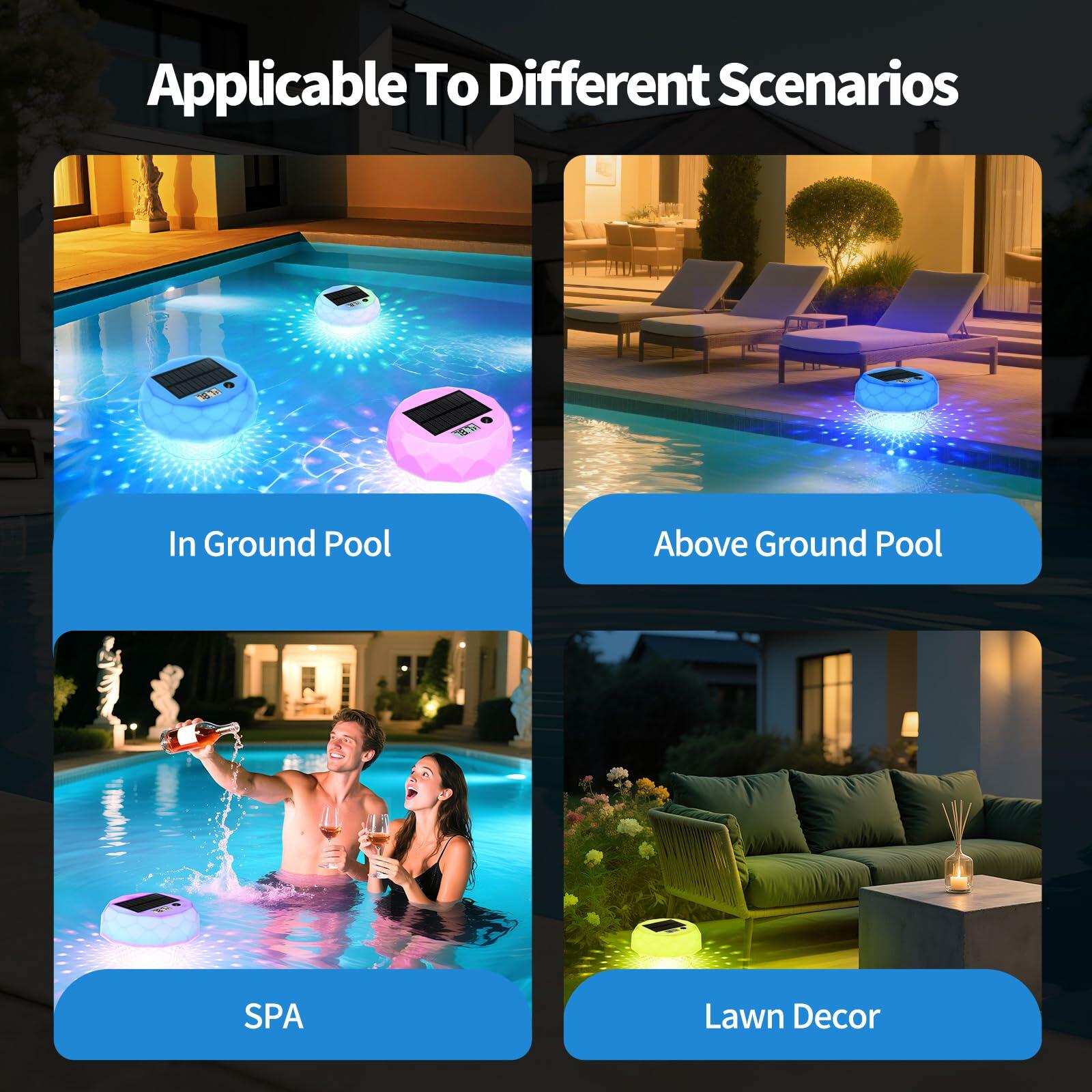- Solar Pool Thermometer:Charges during the day using sunlight and automatically illuminates your pool at night. With larger solar panels, it gathers more energy. Solar pool thermometer detects darkness and lights up with vibrant colors.The 1200mAh battery provides 8-12 hours of runtime on a full charge,extending to 3-5 days during rainy conditions,auto-off & timer feature.