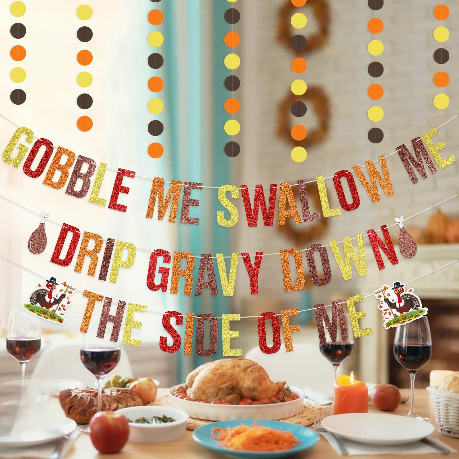 - What you will get: 1Pcs Glitter Gobble Me Swallow Me Drip Gravy Down The Side Of Me banner and 1pcs circle dots garland,full of Thanksgiving feeling.It is a must-have garland to celebrate your Thanksgiving party, brighten up your home party.