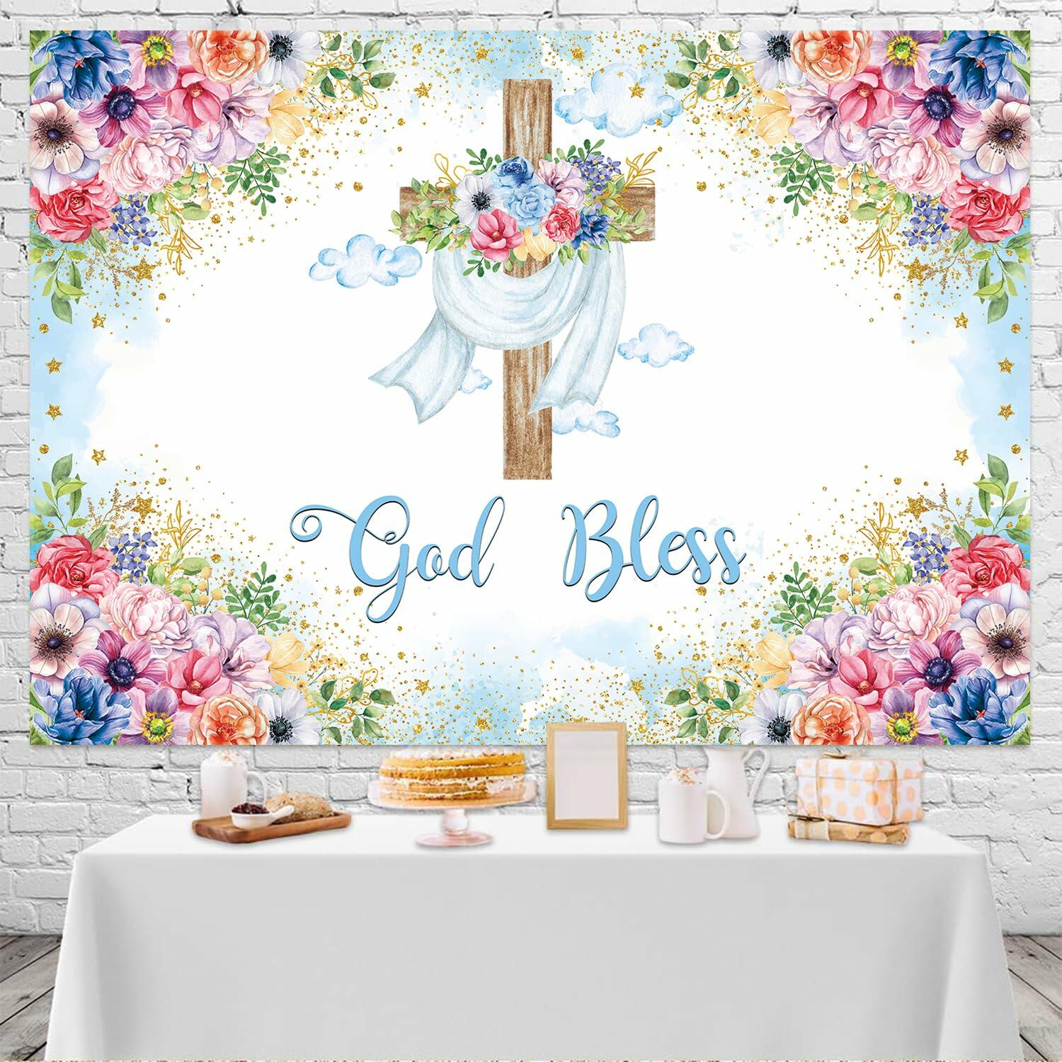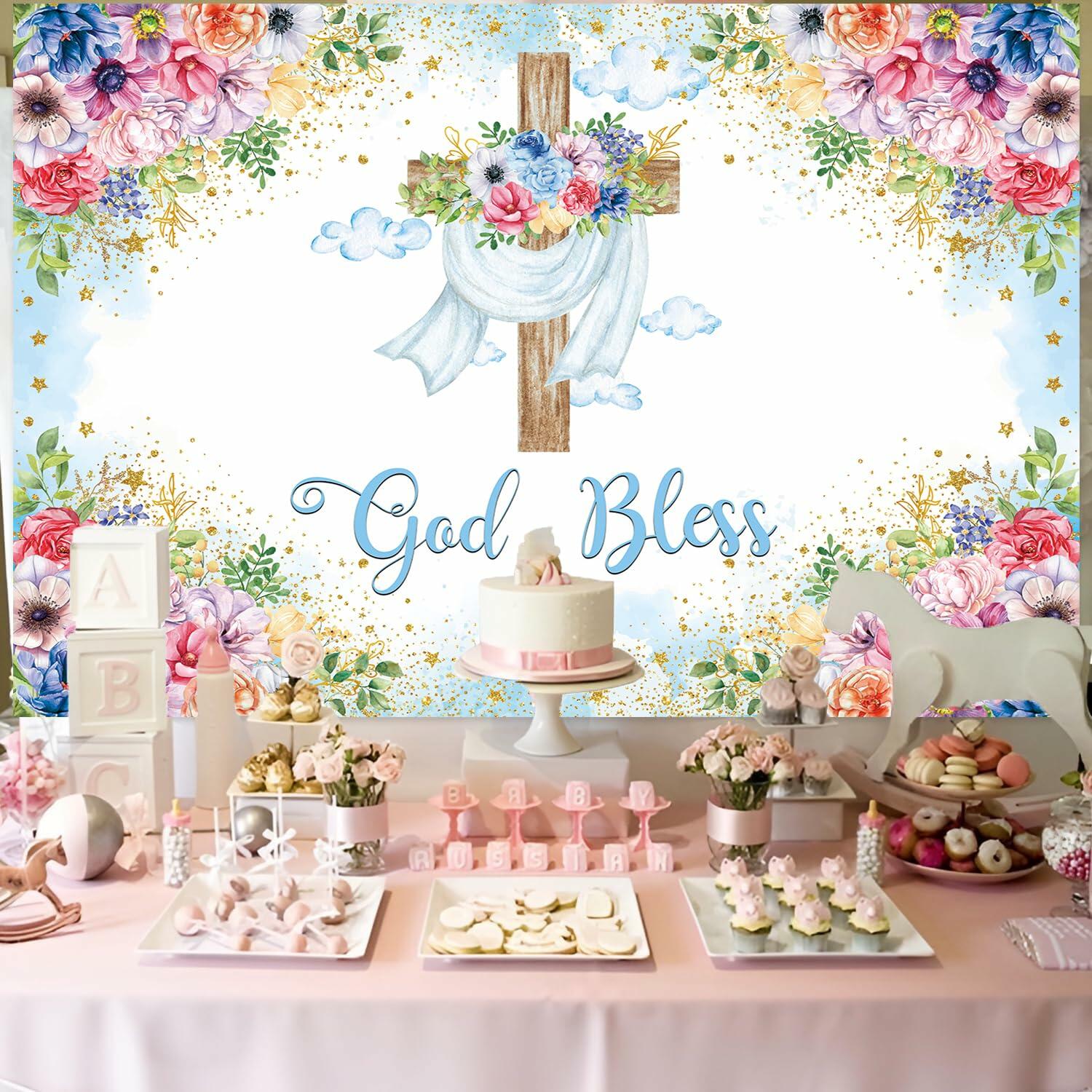 God Bless Backdrop Boy Blue Floral Baptism Party Decoration 7x5FT