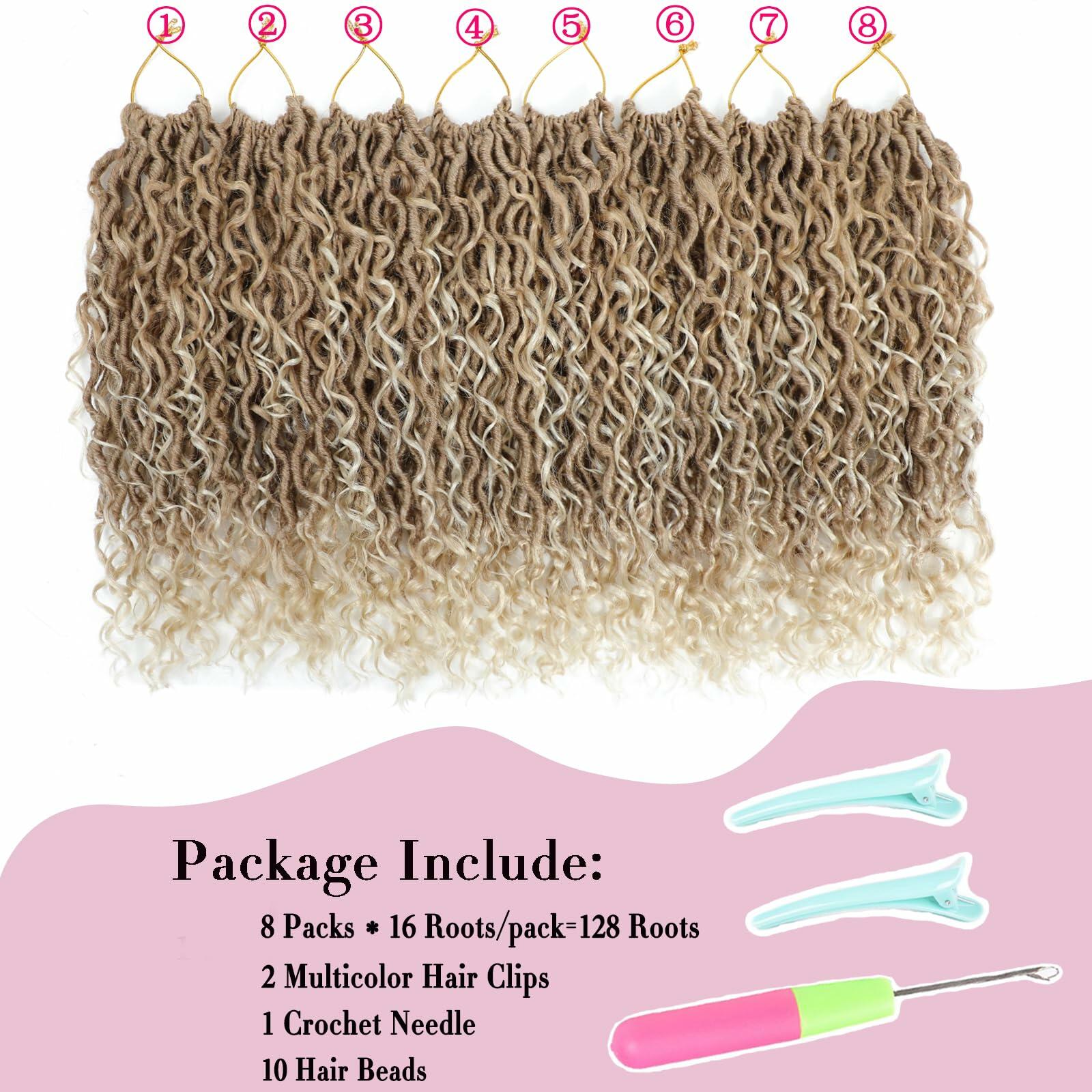 5. River Locs Corchet Hair Package: 8 Packs of Goddess Locs Crochet Hair,16 strands per pack, 128 pieces in total, came with 1 crochet needle+ 2 hair clips+ 10 hair rings