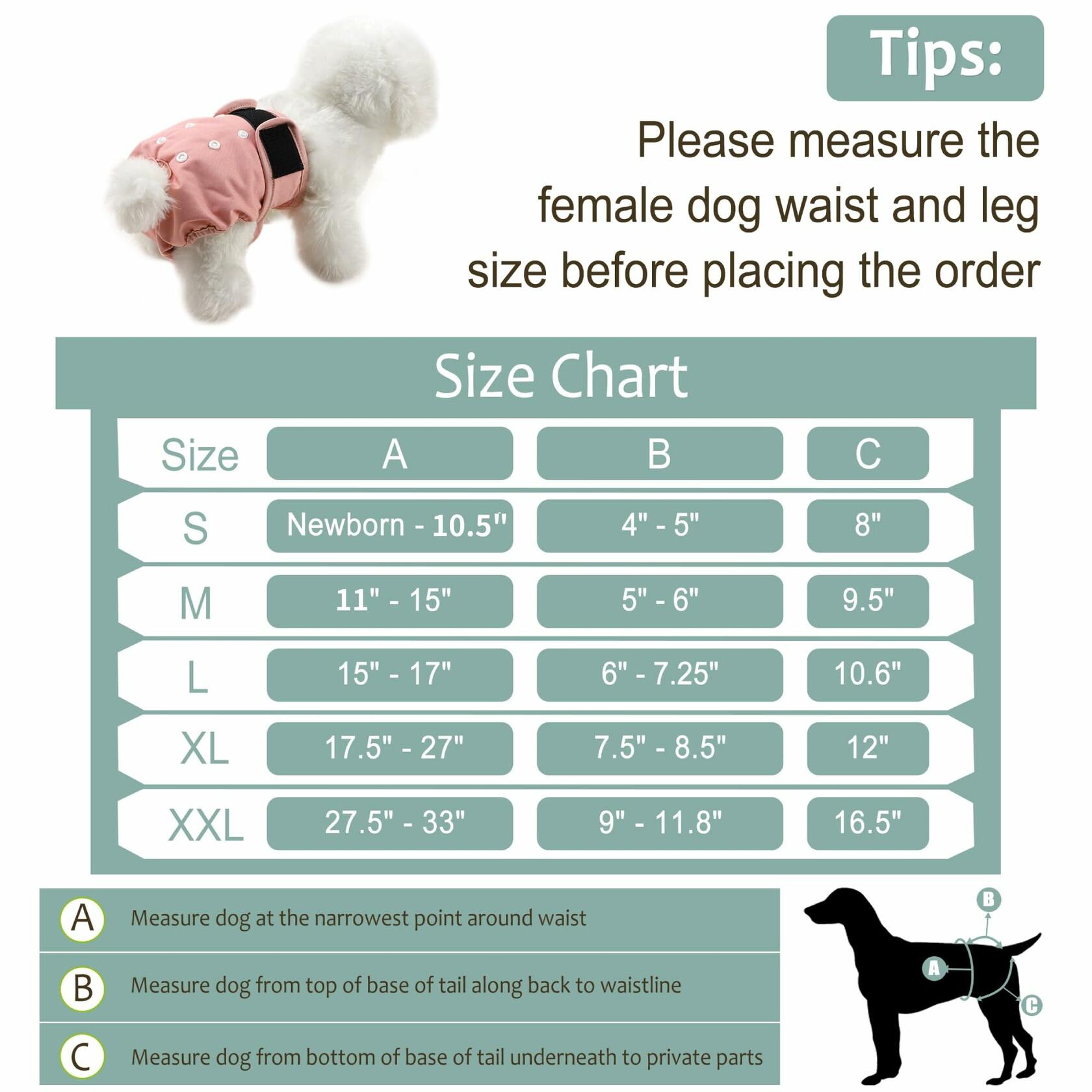 - Size - Our reusable dog diapers have five size to fit different dog’s breed. These washable dog diapers are great for various dog body shapes. Dogs’ waist and the back legs should be measured carefully before you purchase so that the reusable dog diapers are better fit your dog. These washable dog diapers female are recommended for senior pets, dog incontinence, special needs pets and overnight.