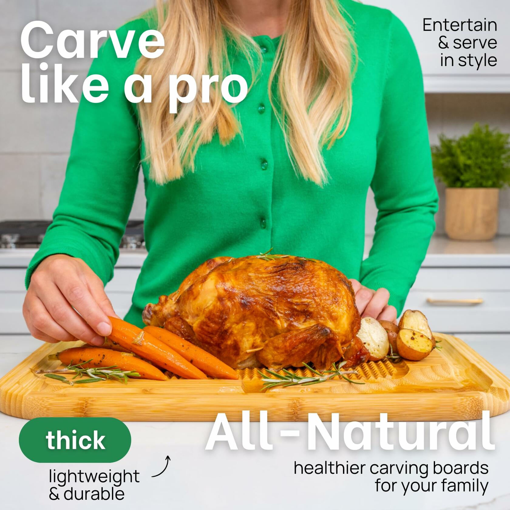 - ENJOY COOKING WITH A SAFER, SMARTER DESIGN - Bamboo's natural properties make this turkey serving platter and cutting board for ribs the perfect kitchen companion. Easy to care for and clean, this kitchen cutting board preserves your knife edge longer and is easy to carry safely from kitchen to table. This wood cutting board with juice groove and convenient pour spout captures juices that you can transform into homemade glazes & gravies. Perfect for health-conscious families!