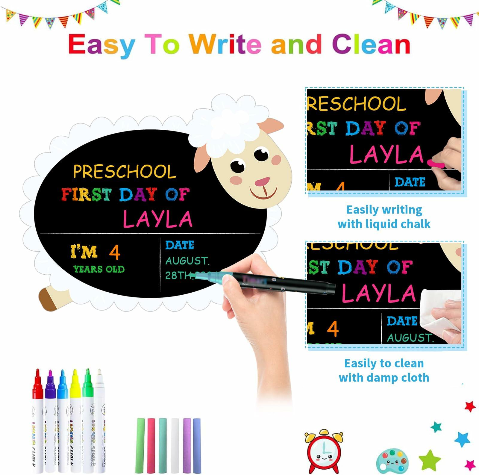 - 【Easy to Write or Erase】: It's easy to erase with damp cloth when writing by crayons, chalk, or liquid chalk. dries clean and fast after wiping. our first day of school board looks new after every wipe, no unsightly residue marks that never come off.