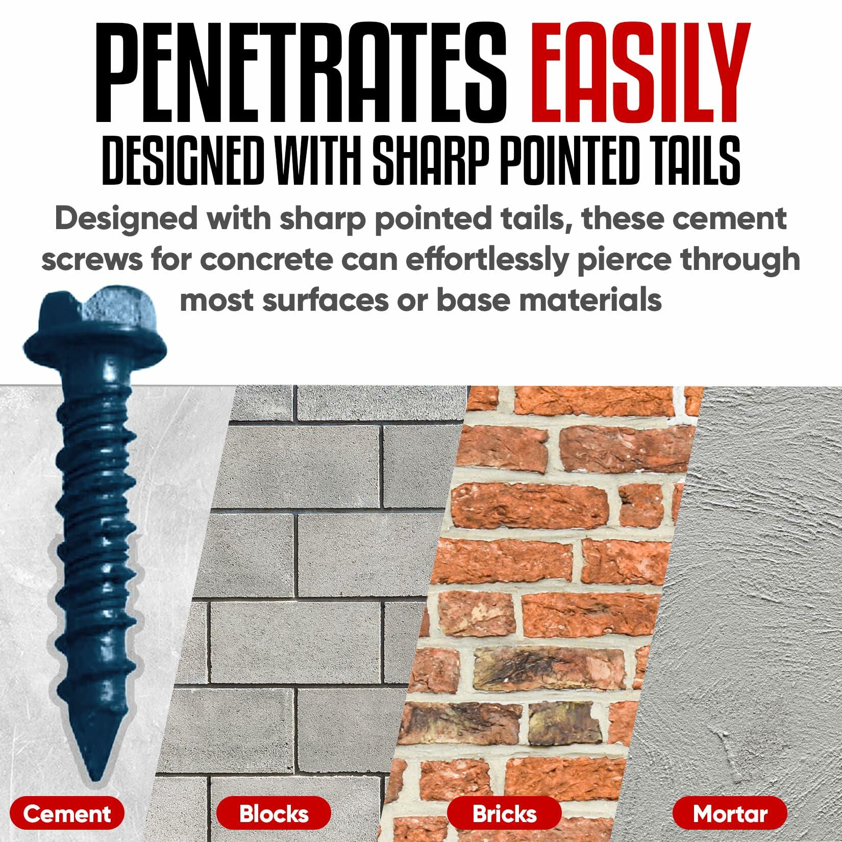 - Penetrates Easily - Designed with sharp pointed tails, these cement screws for concrete can effortlessly pierce through most surfaces or base materials including concrete, blocks, bricks, and mortar.