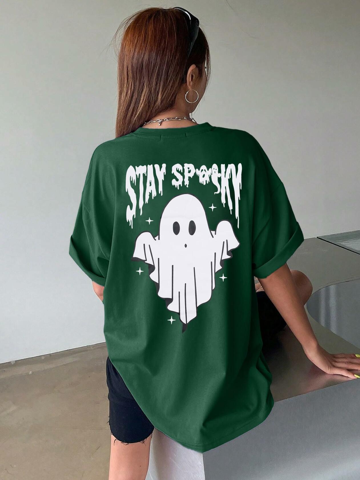 Halloween Oversize T-Shirt Women Cute Spooky Graphic Ghost Tee Green Size L