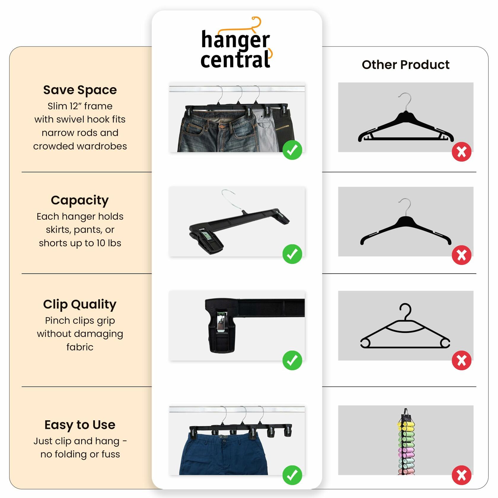 Declutter and streamline your wardrobe with Hanger Centrals 12 Pack of 12-Inch Slim Plastic Pants Hangers with Clips. These space-saving clothes hangers are built from durable heavy-duty plastic and feature strong pinch clips that securely grip pants, skirts, shorts, and morekeeping your garments neatly in place and off the floor. Designed for closets, racks, and laundry rooms, these hangers make it easy to stay organized without sacrificing space. Each hanger features a non-slip ridged clip grip that holds onto clothing of all typesvelvet, felt, cloth, and even heavier items like jeans or wet laundry. The 12-inch width fits a wide range of garments while saving valuable room in tight closets, wardrobes, or tiered storage racks. Whether you're organizing small clothes, school uniforms, or wide skirts, these plastic hangers offer a simple and effective solution. The chrome swivel hook rotates 360 degrees, allowing for easy access to every item in your wardrobe. Great for tight spaces, shared closets, or fast-paced mornings when you need to grab and go. These hooks are also ideal for rotating drying racks or for organizing outfits by type, color, or size. Designed for use in homes, apartments, dorm rooms, boutiques, or laundry setups, the slim design minimizes bulk while maximizing clothing visibility and storage efficiency. The sturdy construction resists bending and warping, making these hangers ideal for daily use. With 12 hangers per set, this pack is perfect for smaller wardrobes, starter closets, or supplementing larger bulk packs. Hanger Central delivers premium closet organization with a practical, stylish design that saves space and protects your clothes.