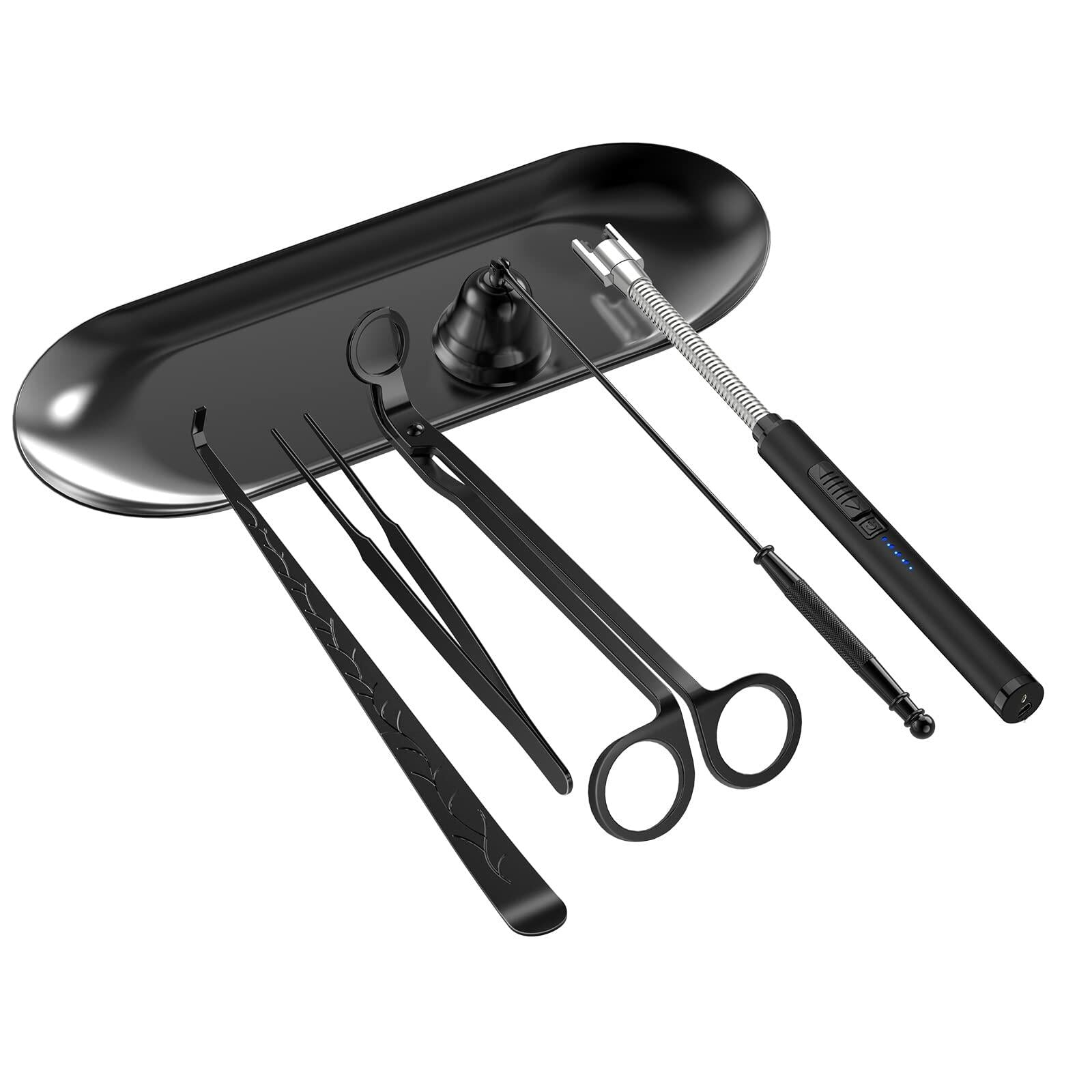 - 🎁 PERFECT GIFT IDEA: The wick trimmer package include the candle wick trimmer is 7 inches long,the candle snuffer is 8.9 inches long, the wick dipper is 7.9 inches long, the tweezers is 4.9 inches long, the tray is 9 inches and 10.4 inches long electric candle lighter. Beautifully crafted candle accessory set any candle lover would be thrilled to receive. Item is as functional as it is beautiful, and comes in a sturdy box and velvet black gift bag.