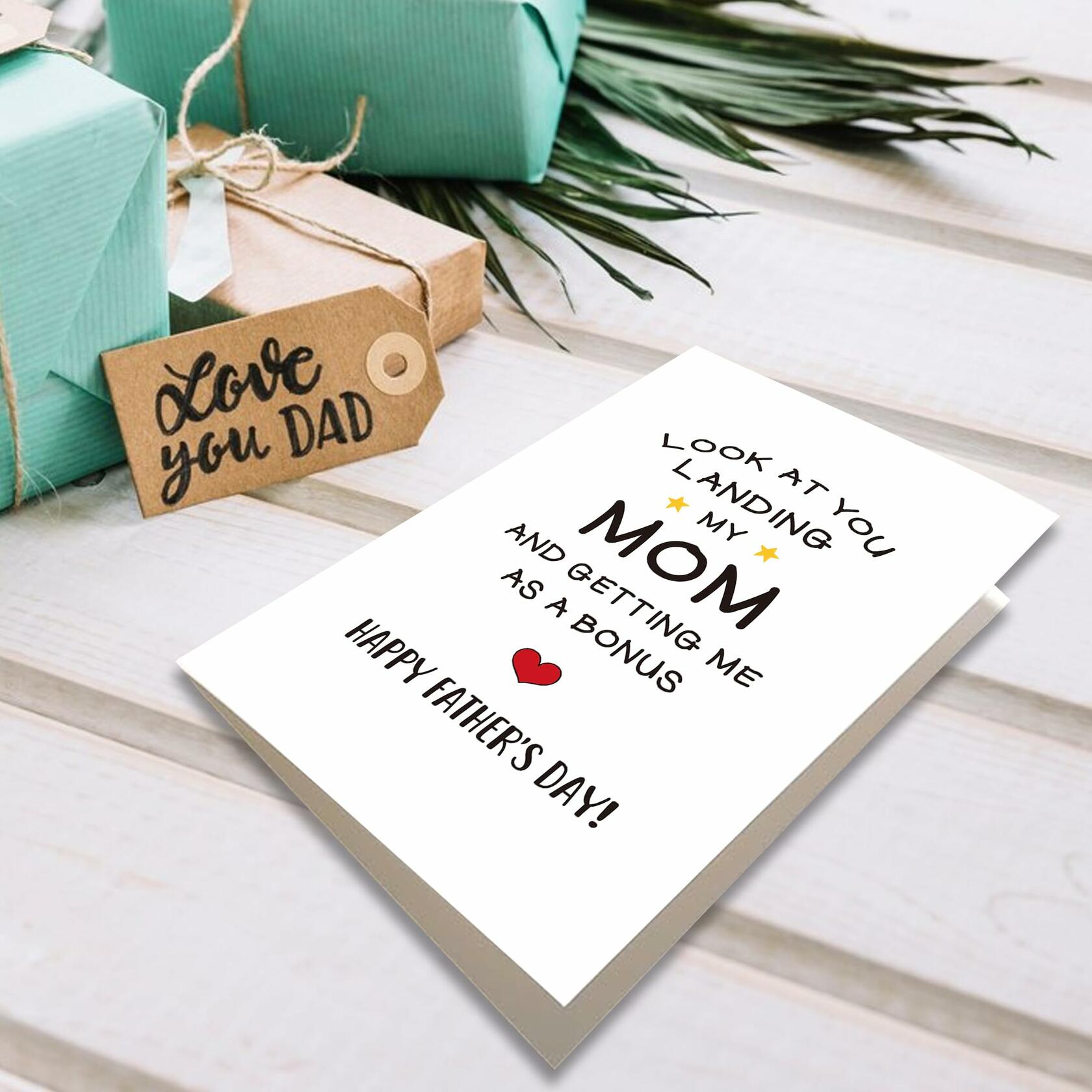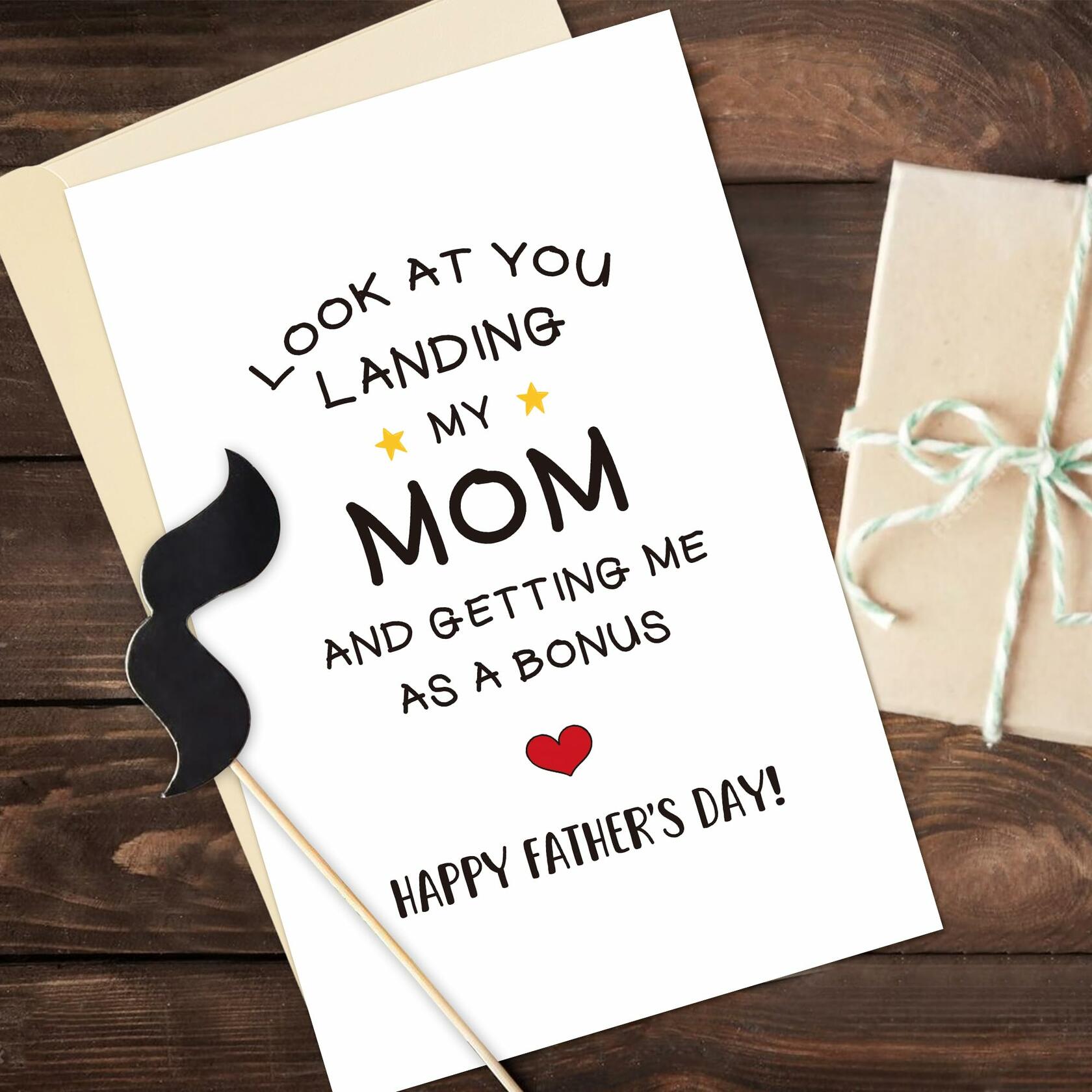 - HILARIOUS DESIGN: This card features a witty message that reads, "Look at You Landing my mom and getting me as a bonus," perfect for bringing laughter to stepdads on their special day