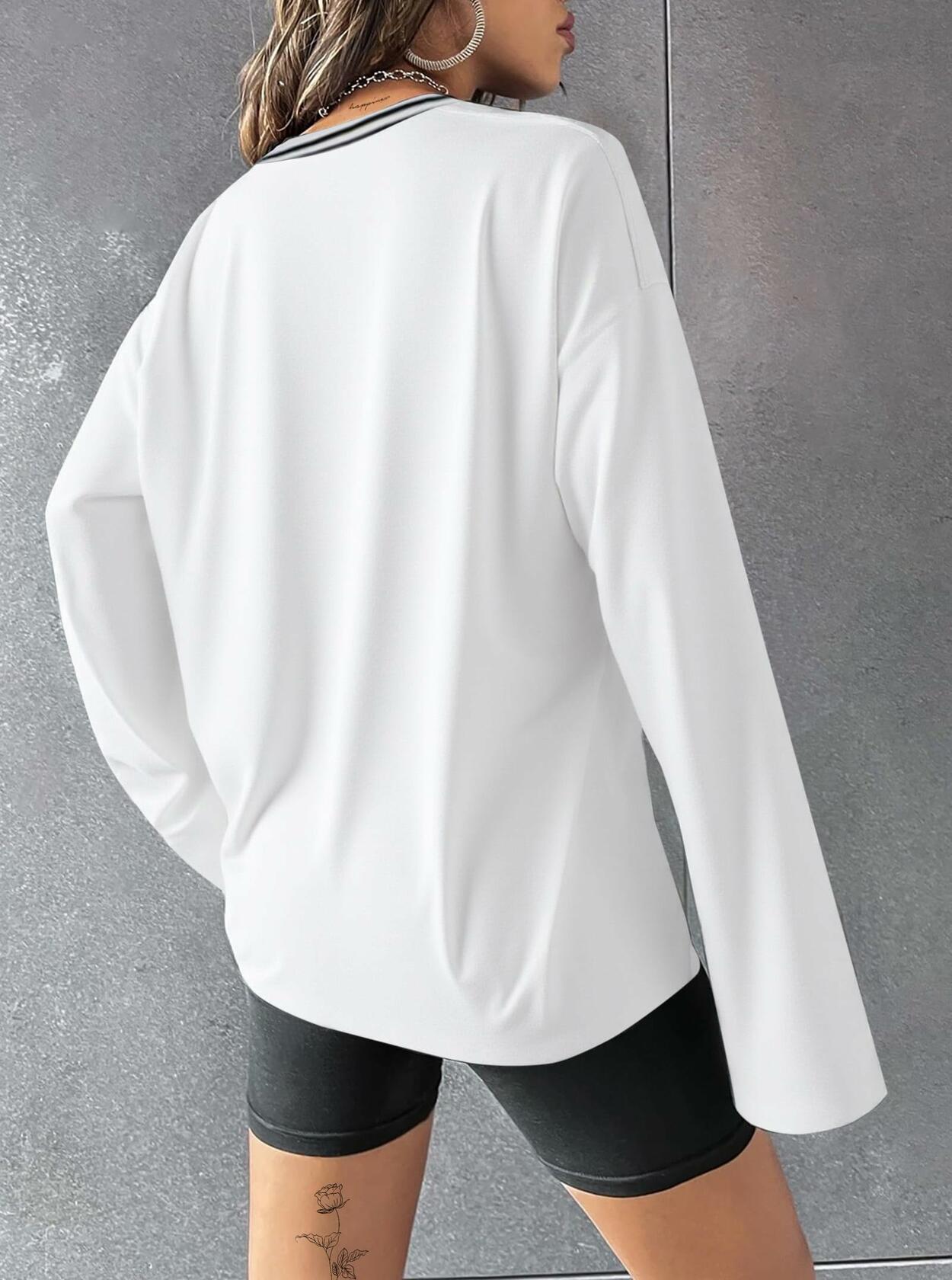Hilinker Women's Oversized Graphic V Neck Long Sleeve Tee White Red Size L