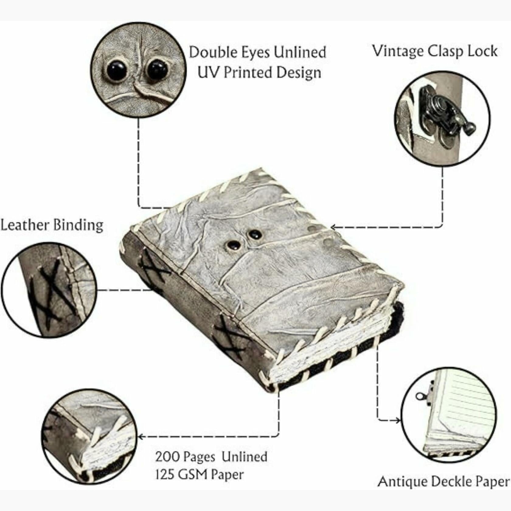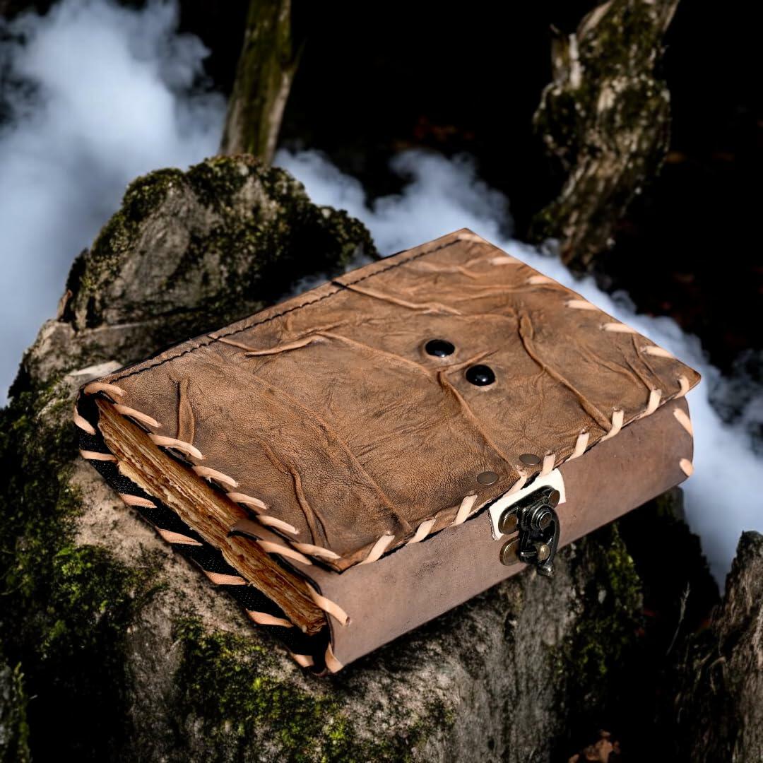 Step into the world of shadows and ancient secrets with this Cursed Replica Journal a Handmade Leather Spellbook Journal designed to captivate. Crafted from premium materials, this Leather Bound Journal evokes the mystery of a bygone era, making it the perfect Vintage Notebook for those drawn to the arcane. Its dark, enchanted charm makes it an ideal Spell Book Journal for Witches, Wizards, and collectors of the unusual. Whether you're using it as a Witchcraft Grimoire, Occult Wiccan Journal, or simply as a Mystical writing Notebook, this piece speaks to the soul of the supernatural. Every detail of this Antique Journal is designed to inspire from the distressed top grain leather and sturdy hand-stitched binding, to the vintage clasp lock that guards your secrets like a spell of protection. It's more than just a journal, its a Vintage Grimoire for Witches and Wizards, a piece of Dark Academia Stationery, and a statement of Gothic elegance. The thick, deckle-edged pages offer a luxurious feel under every pen stroke, transforming your thoughts into enchantments. You can write with fountain pens, gel pens, calligraphy nibs, or even sketch with crayons and watercolor. This is truly a magic book with parchment pages, designed for deep, personal magic. Whether you're preparing for Halloween or searching for a gift for the mystical soul in your life, this Gothic-style spell book with lock makes a powerful impression. Ideal for those who seek witchcraft & Wicca supplies, it functions beautifully as a gothic writing journal, tarot diary, ritual record book, or even Halloween dcor. The compact 7x5-inch size makes it travel-friendly, and its timeless design ensures it will never go out of style. Channel your inner alchemist, witch, or visionary. This handcrafted magical book is more than a journal , its a Mystical diary, a spellbound companion, and a treasured relic of your personal magic. Many Uses: Book of Shadows spell Book are used in many ways - Tarot journal, gothic notebook, skull journal, spell books halloween decorations, book of spells halloween decor. Christmas Gift, grimoire spell book, drawing or sketching and compact for carrying in your bag. Why Choose Us? Unike other leather journal spellbook made with low quality materials, low durability. Our Brand Spellbook are handcrafted by skilled artisan with premium quality top grain leather, antiqe deckle edge paper, 125 Gsm Paper, We only use top quaility materials to make the Spellbook. This aesthetic Grimoire Journal can be used as a Hocus Pocus gifts , the lovers tarot journal, gothic notebook, skull journal, spell books halloween decorations, book of spells halloween decor. grimoire spell book, drawing or sketching and compact for carrying in your bag. Ideal for alternative Artist Sketchbooks, Photo Album, Traveling Notes, Business Executive, Logbook, hocus pocus spell book , Journalists, Food Planner, old spell notebook, antique handmade skull journal
