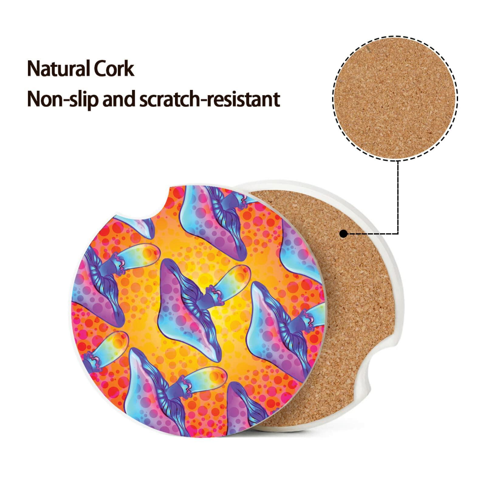 Size2.56" x 2.56" x 0.23", 2 Pack Car Coaster Set is designed to fit cup holders in most cars, vans, boats, SUVs and trucks. Absorbent Ceramic MaterialThey are made from a special absorbent ceramic stone with natural cork base, that can absorb the liquid drops and other spill outside the cup. Easy to CleanJust rinse and brush with water, and finally dry. Humanized Notches DesignThere is one convenient notch on the side of the coaster for easy removal. Best GiftThis special gift is very suitable for your family, friends, colleagues, etc.