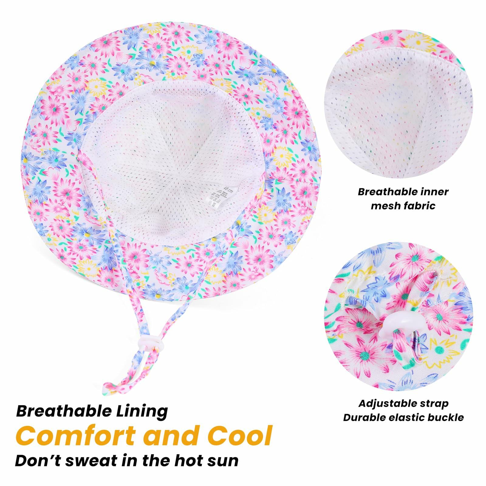 Adjustable hat circumference offers a customized fit and adjusts as your baby grows, adjustable chin-strap feature helps ensure that the baby sun hat remains secured on when windy ,This baby sun hat has three size for your choose, suitable for 0-6 months, 6-24 months, 2-6 years old infants,little boys,girls, children and so on. The age is only for reference, you can choose sizing according to your baby's head girth.