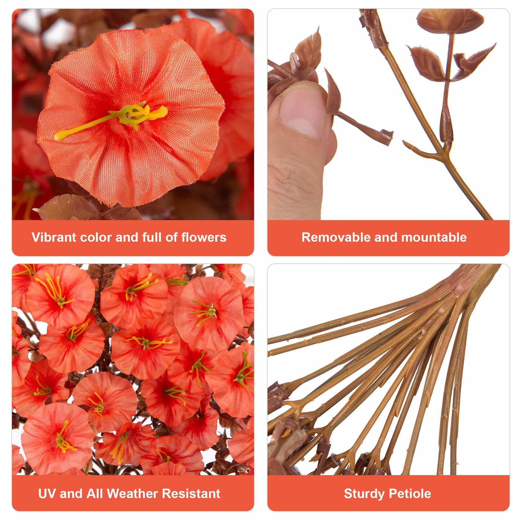 - UV Resistant and Never Fade:These artificial hanging flowers are UV resistant and never fade, can be put outside, living room, office, kitchen, garden, balcony, wall, porch, window, balcony, yard, urn, planter, payhway, front door, flowerbed sill or indoor veranda. Perfect for home, weddings, hotels, terrace, guesthouses, parties or other indoor outside place decoration, create an illusion of enlarged space.