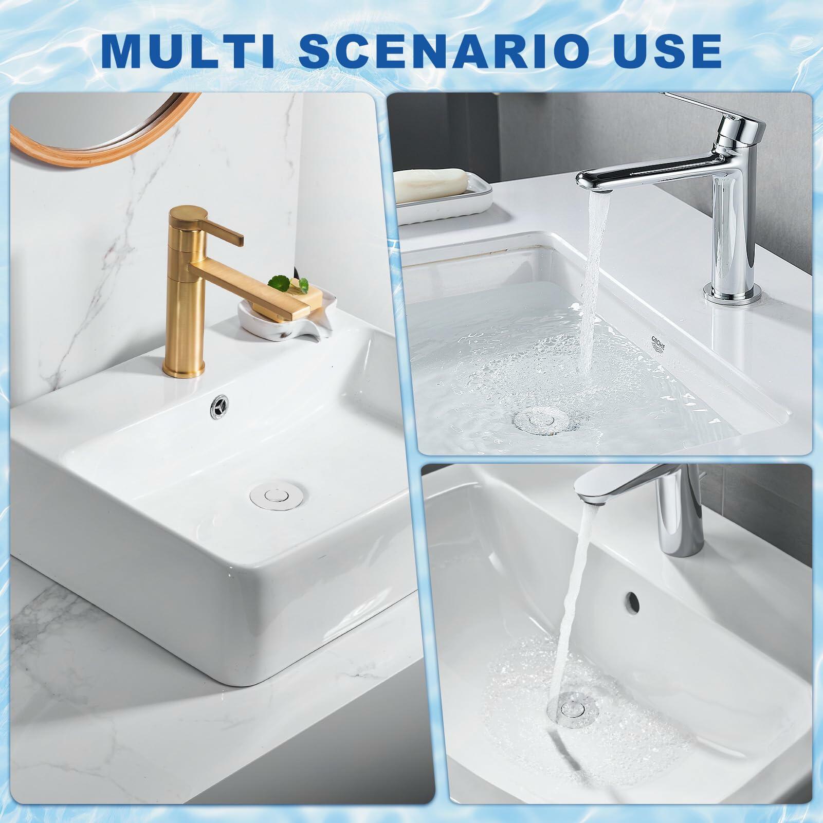 - [Durable Pop-up Mechanism] Crafted from high-quality stainless steel, solid brass, and premium ABS plastic, this sink stopper is built to last. The reinforced pop-up core delivers smooth operation, allowing seamless switching between water retention and fast drainage with a single press. Enhanced corrosion resistance ensures long-term reliability in daily use.
