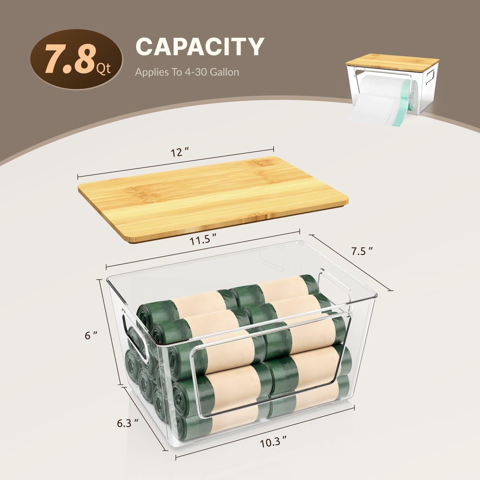 - Space-Saving Design for a Tidy Laundry Room: Our stackable trash bag holder dispenser is an excellent choice for laundry room organization and storage. It allows you to neatly stack multiple bins, maximizing vertical space and keeping your laundry area clean and organized. The top bamboo cover adds a touch of elegance while providing extra storage space for other laundry essentials
