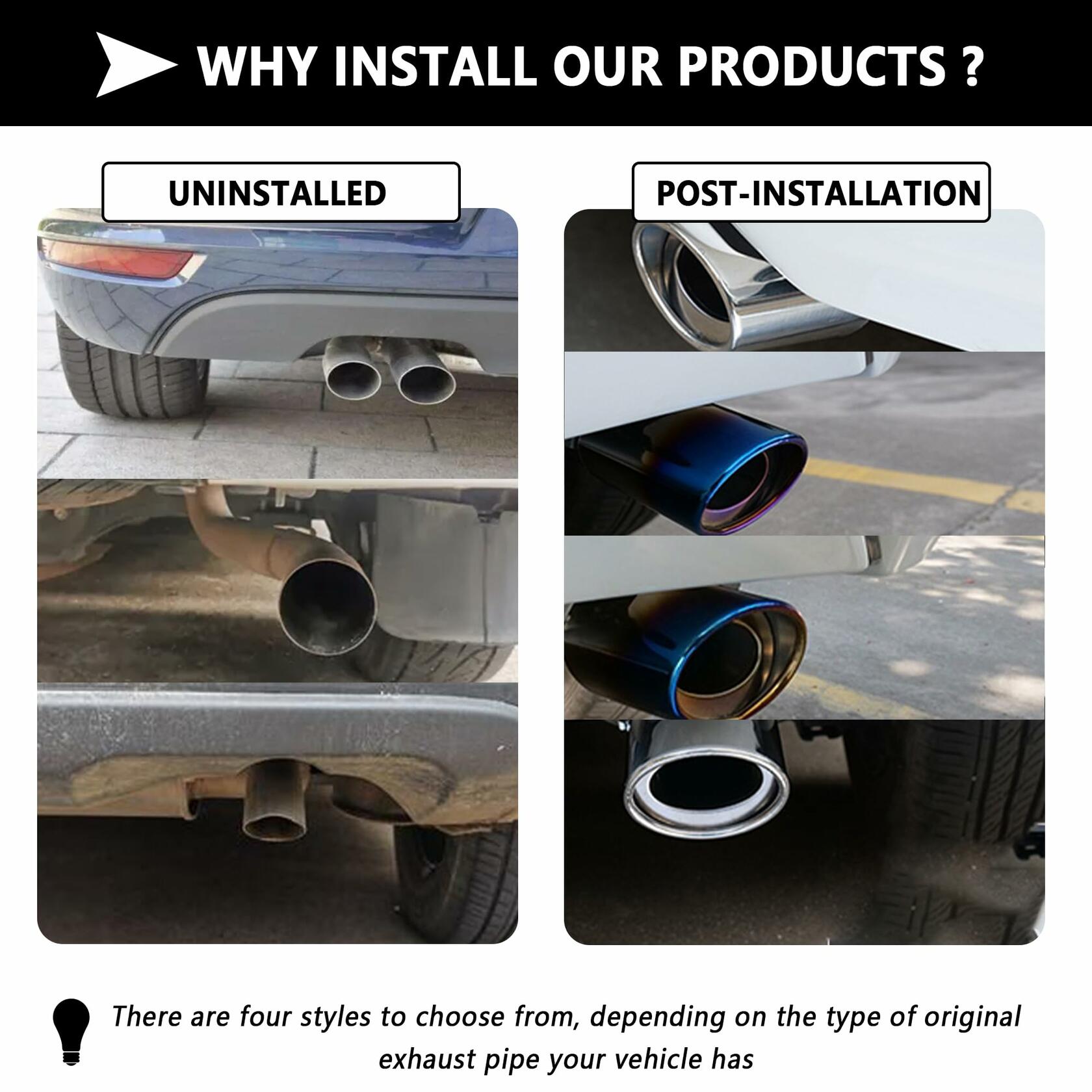WHY CHOOSE US?New upgraded stainless steel exhaust tailpipe, cool polished frosted blue appearance design, increase the attractiveness of your car. No tool installation, three installation holes design, using bolt connection installation more solid, not easy to fall off.[Tailpipe Specifications]✔ Material: Stainless Steel✔ Size: 5.51x3.89x3.34 inch (Straight Exhaust), 5.51x2.95x3.38 inch (Curved Exhaust)✔ Color: Bright Silver Straight / Bright Silver Bent / Burnt Blue Straight / Burnt Blue Bent✔ Style: Curved Exhaust Pipe, Straight Exhaust Pipe✔ Products Include: 1x Car Exhaust Pipe[Attention!]✔ Please wear gloves when installing to prevent injury.✔ Please do not install this product when the car is just stopped or started to avoid injury by the exhaust pipe.✔ The distance between the tailpipe and the bumper needs to be greater than 2cm to avoid the high temperature of the exhaust gas burning the bumper.Perfect After-Sales Service: We dare to promise to our noble customers. If there is any quality problem, we are willing to resend a new one for free or give you a full refund. We produce the best quality, no hassle for life with 24 hours response service is friendly.