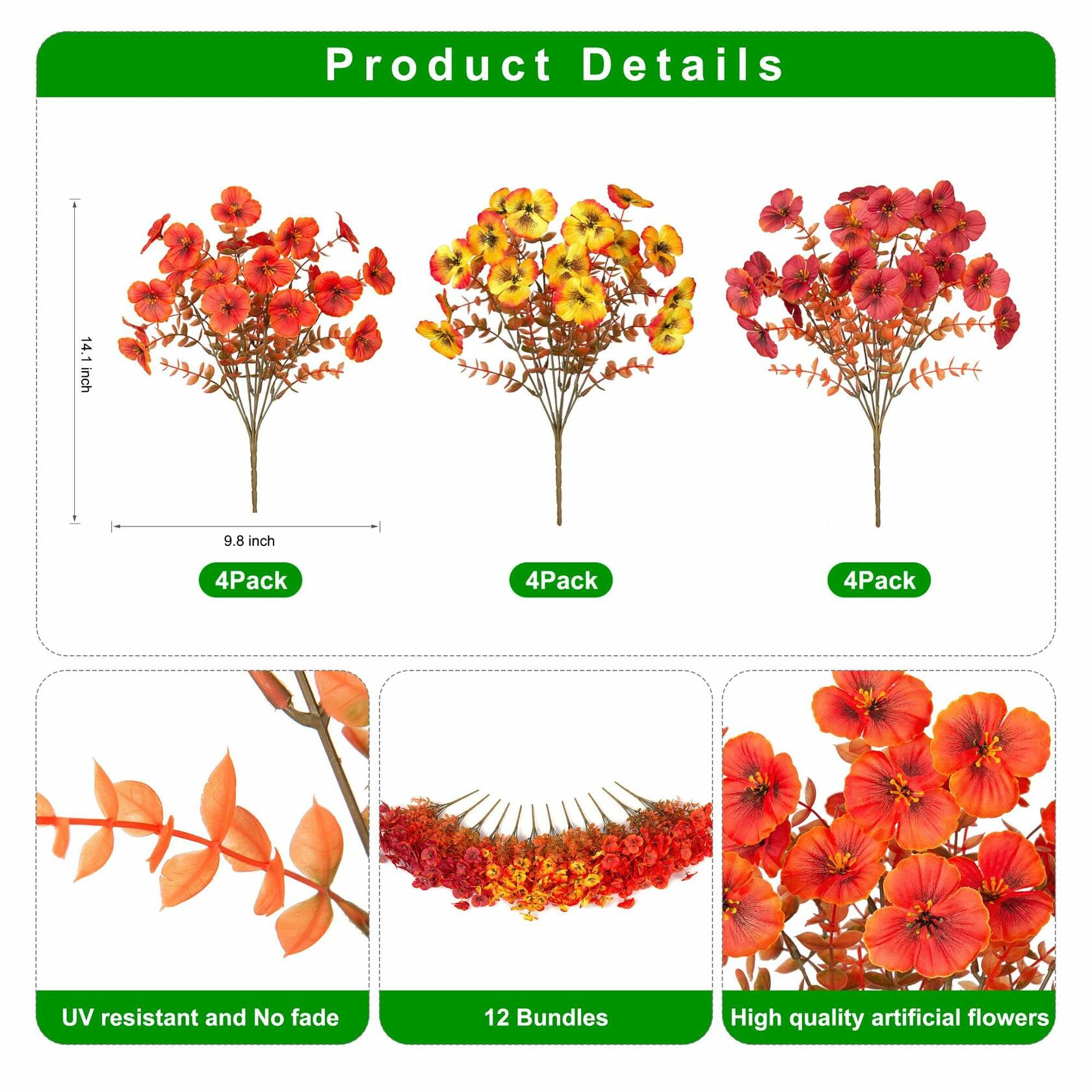- 12 Bundles Vibrant Faux Pansies: Package includes 12 bundles of fall faux pansies flowers (orange*4, red*4, yellow*4), Each outdoors artificial fall flowers measures 14.1" (L) x 9.8" (W), the removable vibrant silk flowers and flexible eucalyptus branches make DIY easier and funny, and you can create stunning artificial flower arrangements for this autumn