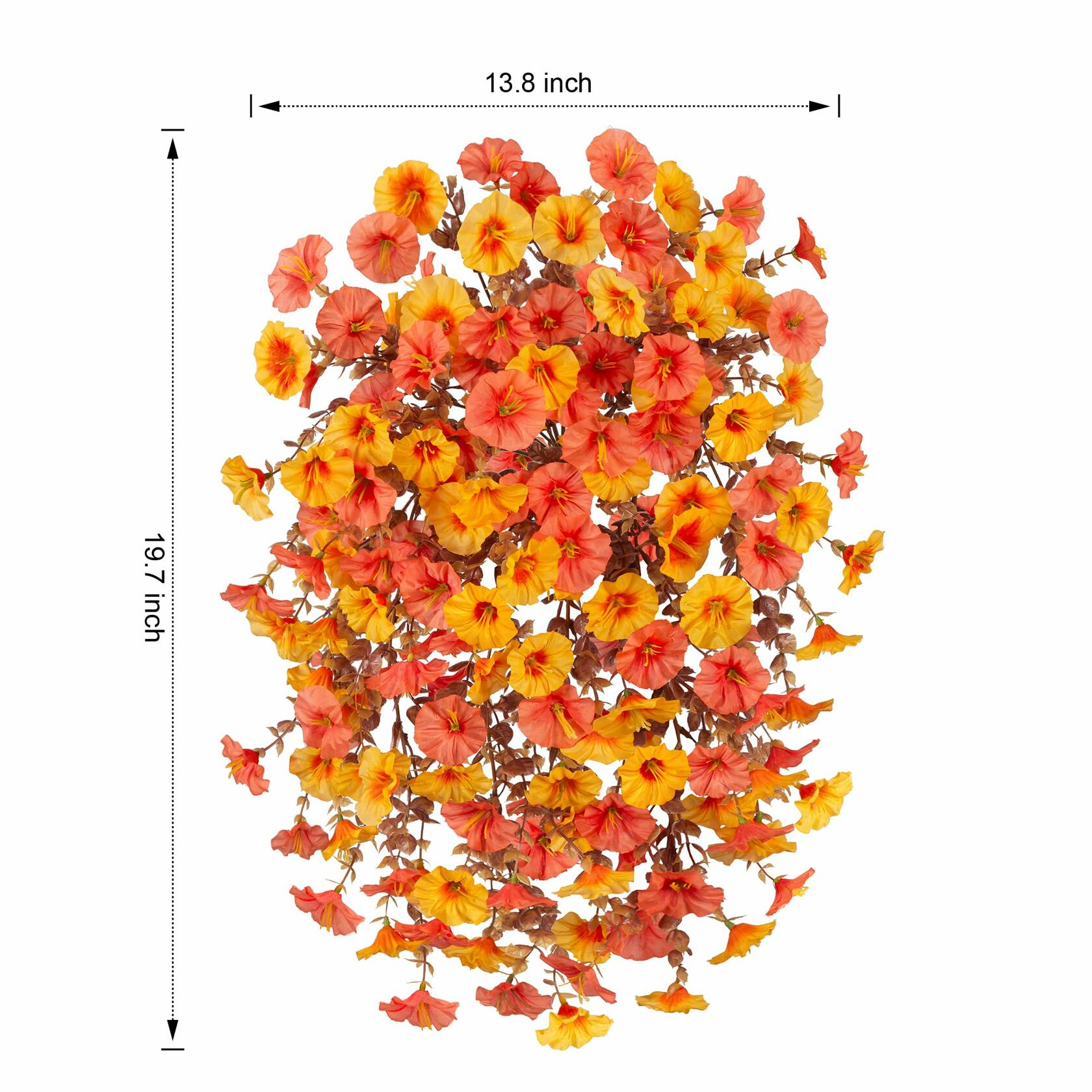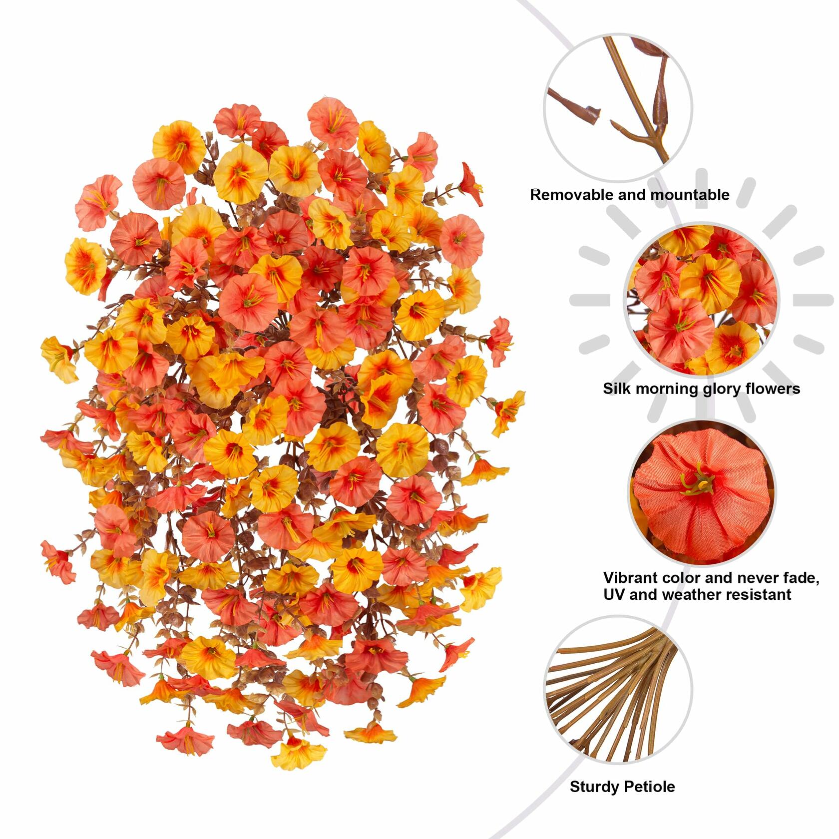 - High-quality Fake Hanging Plant: Morning Glory flowers and leaves made of high quality silk.The artificial hanging flower branches are made of high-quality metal wire and plastic.The artificial hanging plants are maintenance-free, durable and recyclable. Furthermore, fake hanging greenery vines are UV resistant and waterproof, making them perfect for any outdoor space.