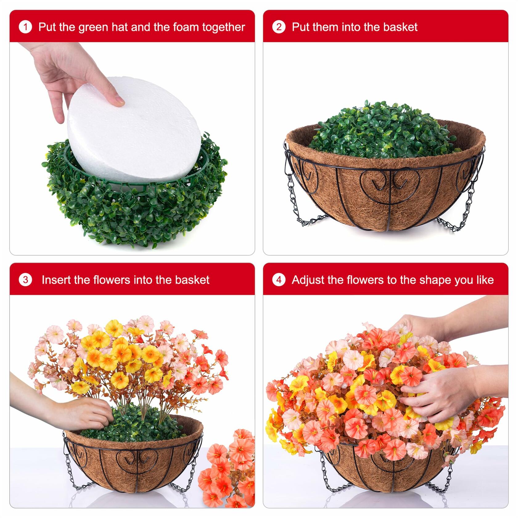 - Easy Installation: The size after assembly is approximately 19.6" x 19.6" x 20.5 "(LxWxH); The basket measures 12" x 12" x 5.5"(LxWxH) and the chain length is 15 inches. Flower baskets are very easy to assemble. You just need to arrange the flowers according to your preference.