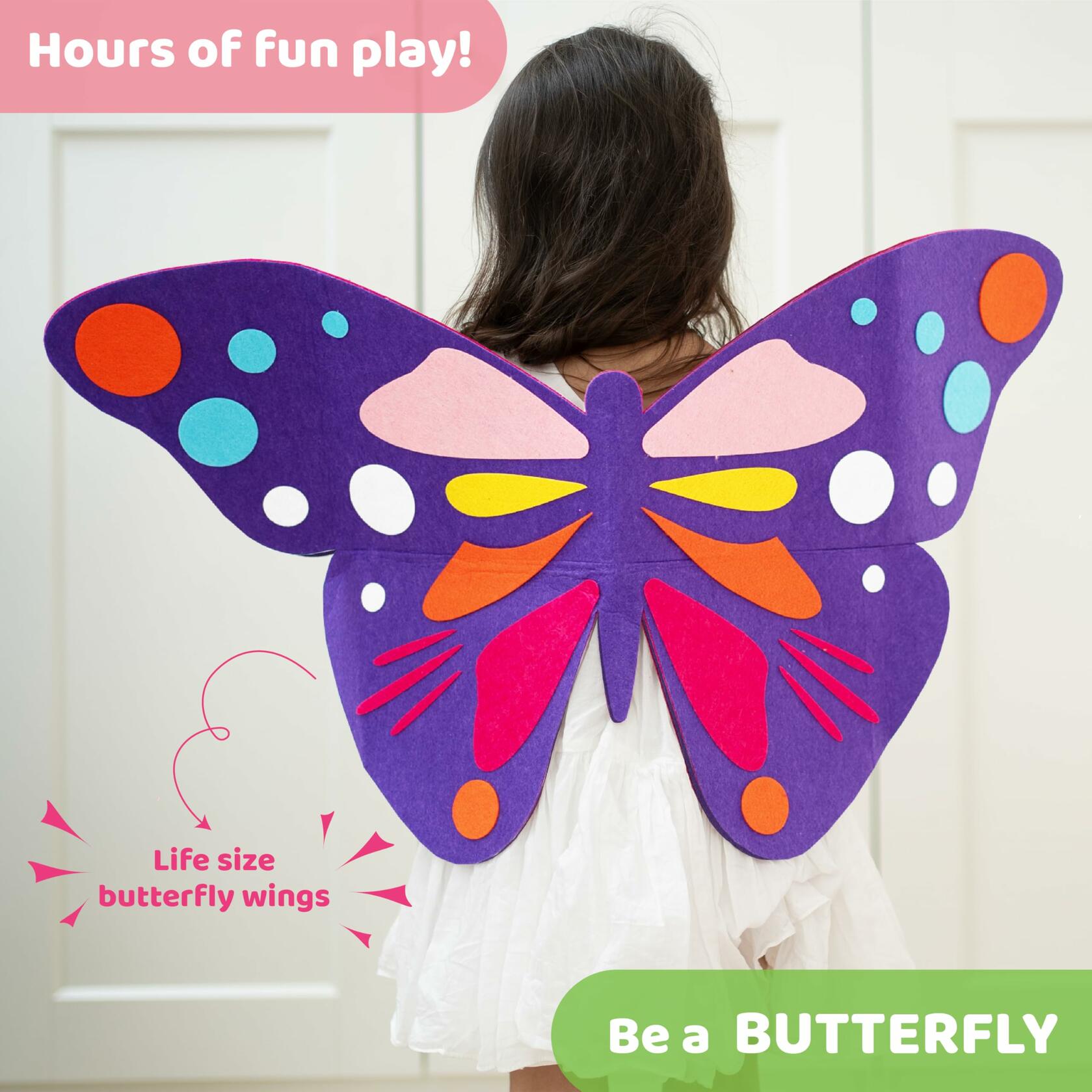 - Enter the world of beautiful Butterflies – With our Butterflies costume kit. This kit includes butterfly wings that can transform your child into a butterfly, a butterfly crown that can make them the king or queen of butterflies and a flower wand to spread their little magic.