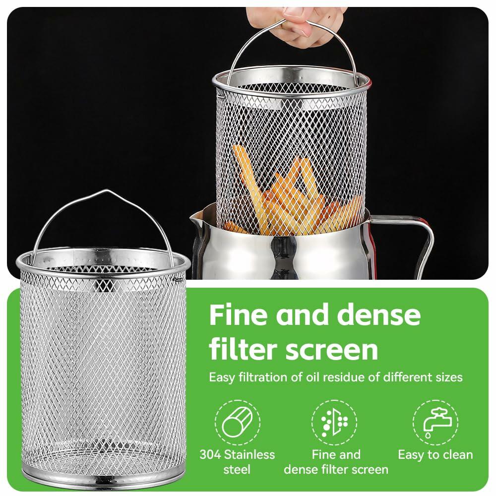- 【Multifunctional Oil Strainer & Deep Fryer】This stainless steel oil filter pot doubles as a deep fryer with a frying basket, perfect for filtering and cooking. Ideal for frying french fries, chicken nuggets, onion rings, and more. Save kitchen space with this 2-in-1 oil strainer and fryer!