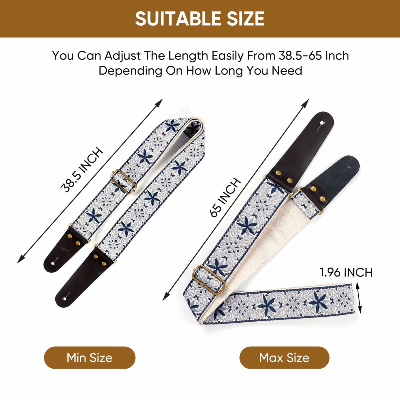 Creative petal embroidery pattern, exquisite and high-end, available in brown/blue, strong and durable。 Adjustable length, equipped with emphasis buckle, adjustable range: about 35 "-59" (89cm-150cm), convenient and comfortable. The width of the shoulder strap is about 2 "(5cm) Premium leather ends, can be used for a long time without breaking. Gift: Accessories for guitarists, including 3 Picks, 2 anti slip locks, and 1 headband, suitable for acoustic guitars and classic guitars! Best Gift Set: Guitar Strap * 1, Strap * 1, Headband * 1, Anti slip Buckle * 2, Guitar Picks * 3, Suitable for all guitarists.