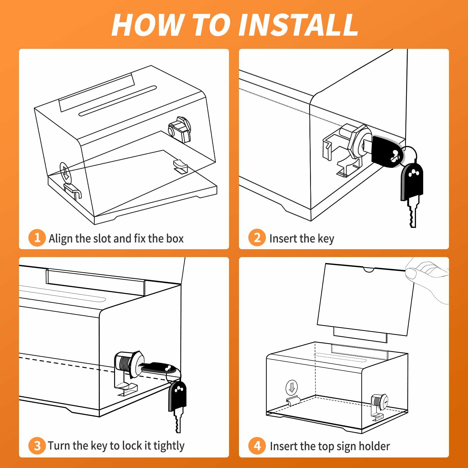 - How to Install: 1. Align the slot and fix the box;2. Insert the Key; 3. Turn the key to lock it tightly; 4. Insert the top sign holder.