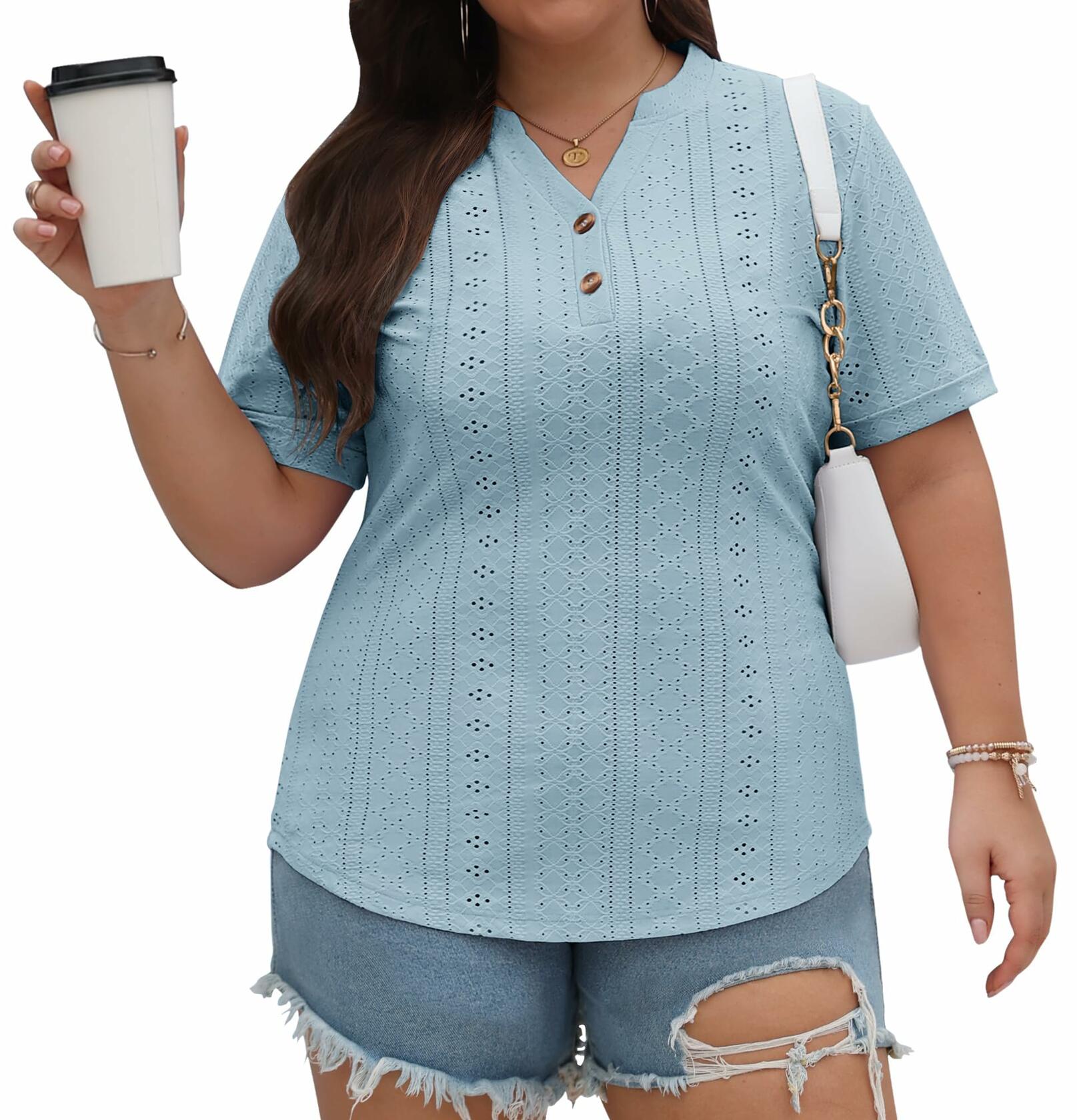 Plus size tops for women feature fashion roll short sleeves, casual v neck, sexy buttons up with perforated designs,providing feminine and chic look for ladies.
