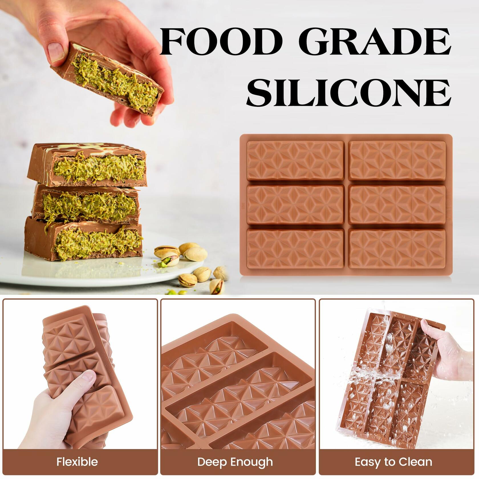 - Upgraded 1 Inch Deep Chocolate Mold: KASHME's dubai chocolate mold is 1 inch deep, deeper and larger, better to fill than regular thick chocolate molds. The stuffed chocolate bar mold allows you to make sugar-free and low-carb pistachio chocolate bar for your children and families, giving your family a great healthy diet
