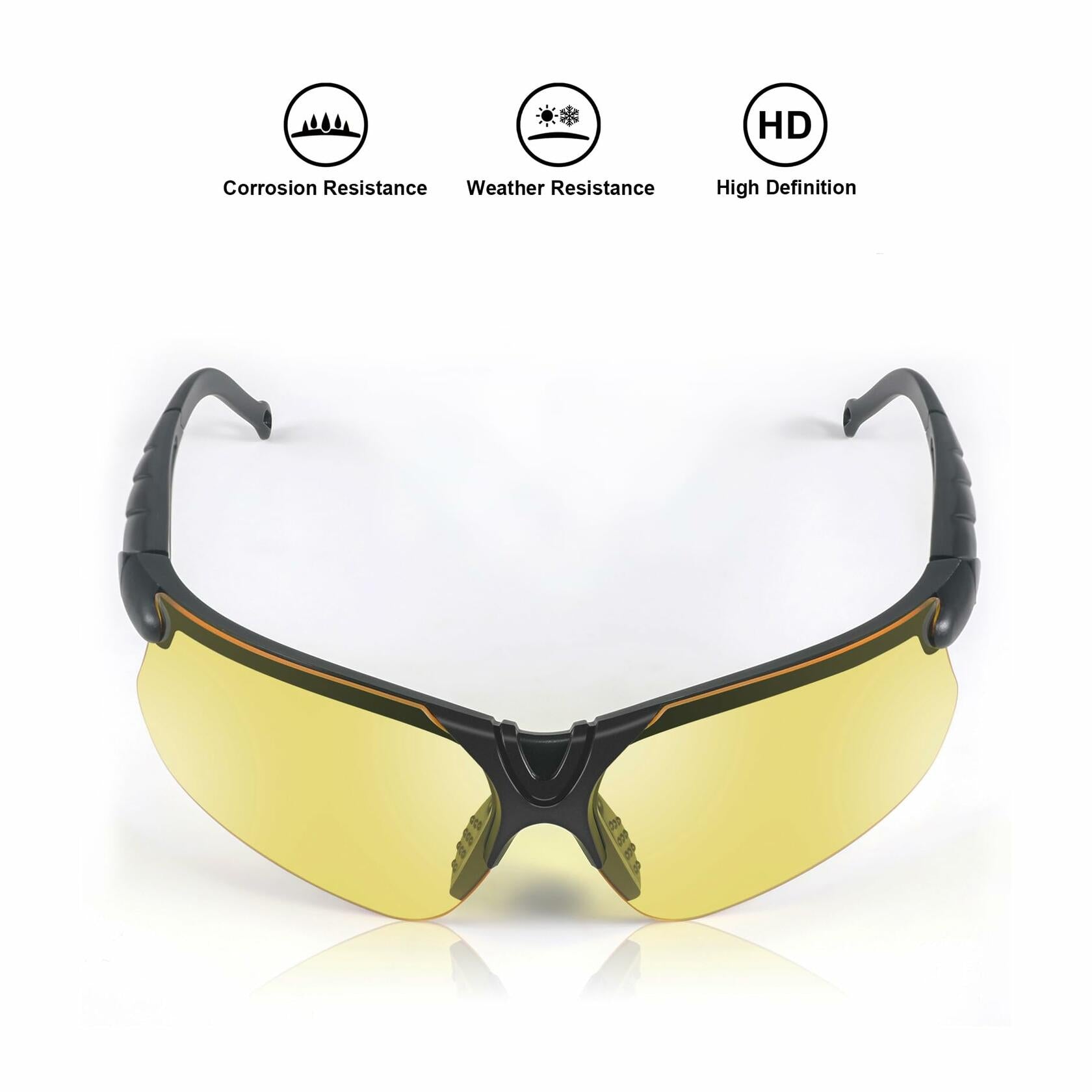 - 【UPGRADED ANTI-FOG LENSES】- Shooting range glasses have 1 pair each of interchangeable grey and yellow lenses. All lenses is anti-fog, scratch resistant, impact protective. The Polycarbonate UV400 protection lenses can blocks 99.9% harmful UV rays.