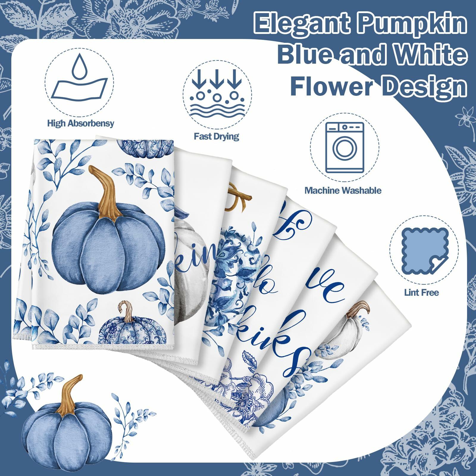 Kinlop 6 Pcs Fall Thanksgiving Blue White Pumpkin Kitchen Towels 16x26 Inch
