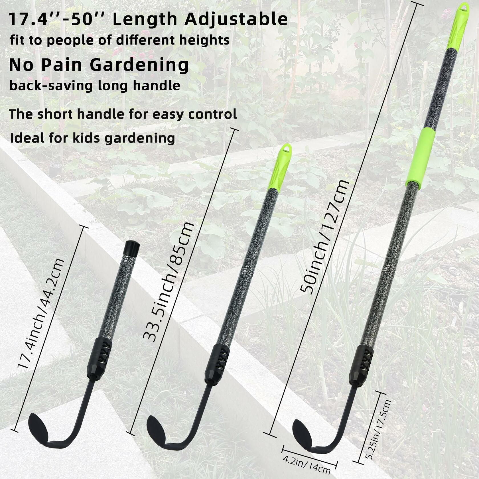 - Adjustable Height: hand weeder tool features a 3 adjustable lengths designed to fit your body: 18 INCH / 34 INCH / 48 INCH, that is suitable for people of different heights, relieves back strain. Alloy steel handle is sturdy enough to resist bending or breaking, and rust resistant coating that provides excellent durability for long term use