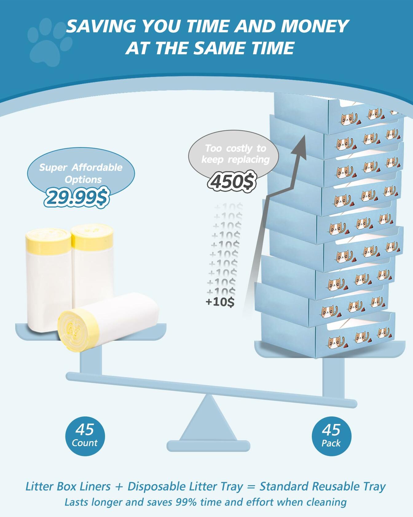 - SAVE ON MONTHLY EXPENSES: This litter box liners comes in a box of 45 and costs just under $30. 1-2 count week will last about half a year, and will be the ideal choice for pet-owning families