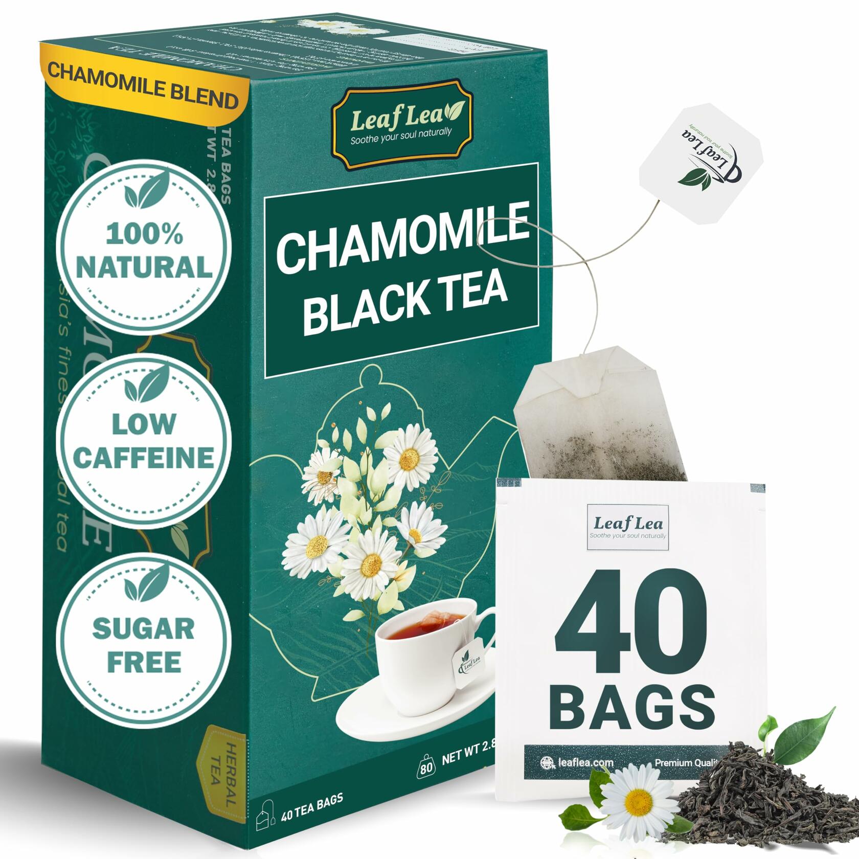 - ✅ LEAFLEA CHAMOMILE BLACK TEA: Discover the serenity of Camomile Flowers and Black tea with our Chamomile Black Tea . Crafted from pure Chamomile flowers and Black tea , this blend is one of the widely known ancient herbs that provide daily goodness. Completely natural, enjoy its soothing sensation at any time!