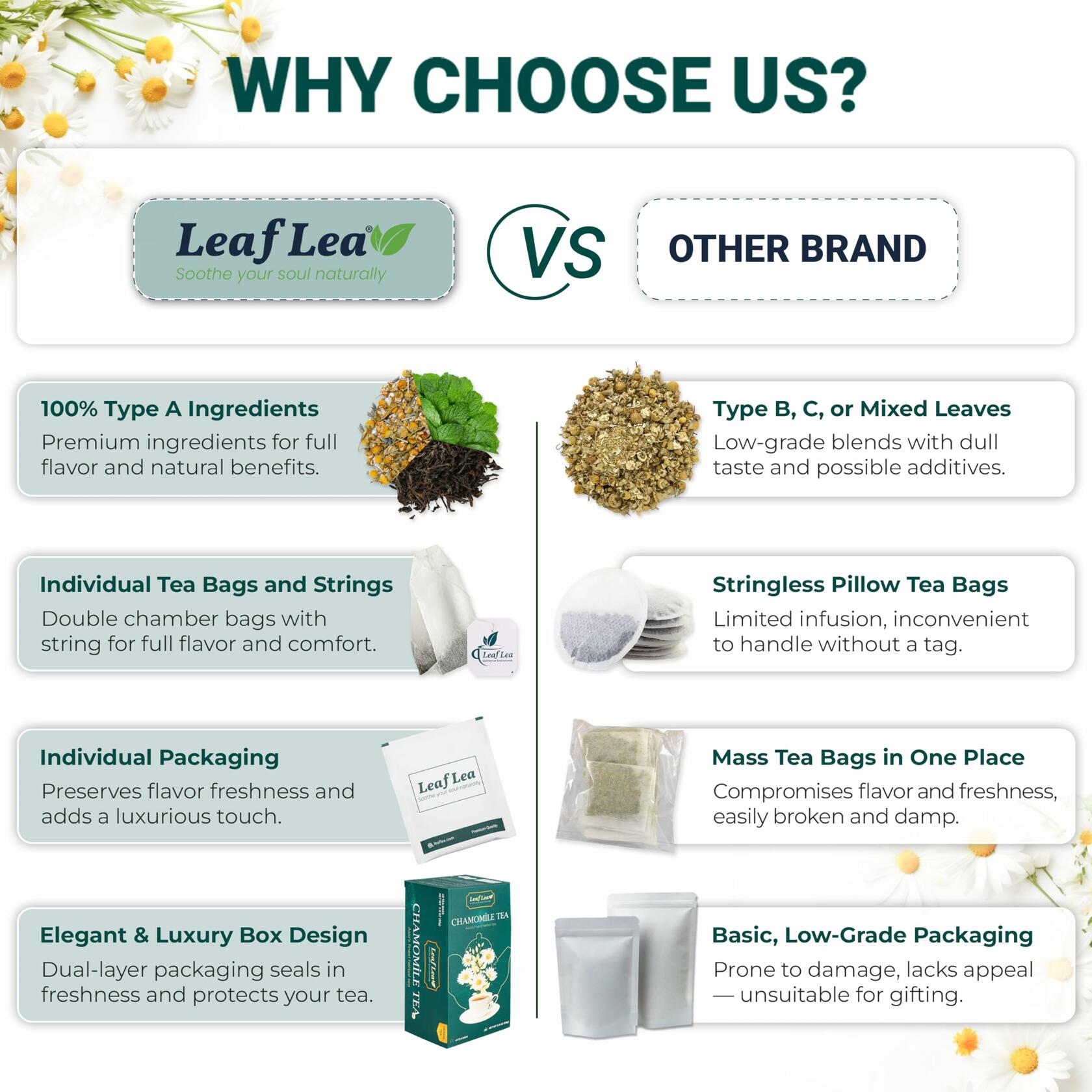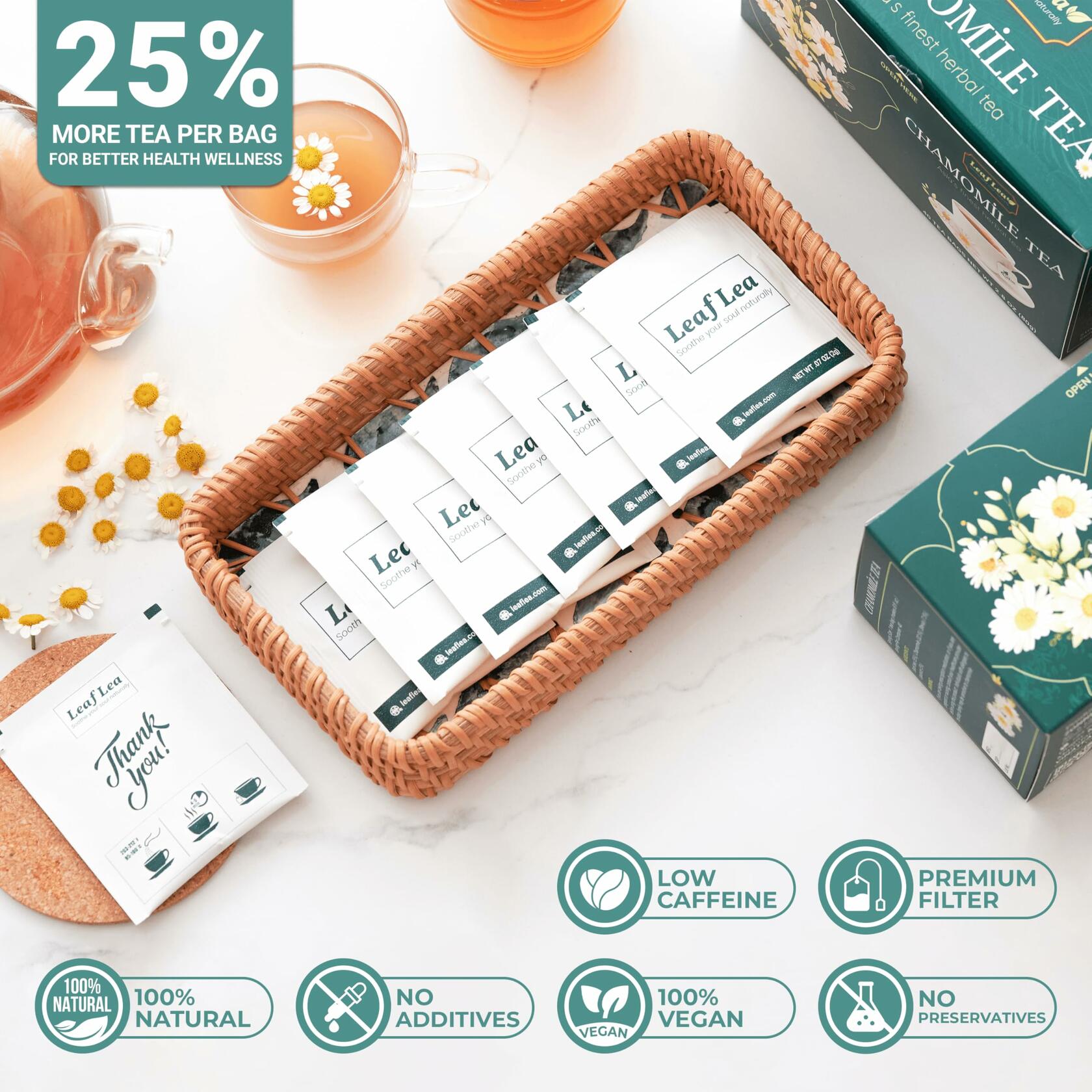 - ✅ INDIVIDUALLY SEALED TEA BAGS STAY FRESH: Take your chamomile tea bag on the go in your purse, workout bag, backpack, school or work desk or car; Each tea bag is sealed for freshness so every cup of LeafLea is the perfect cup of LeafLea