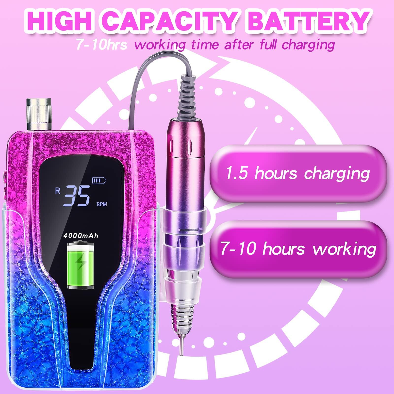 - [ Rechargeable & Portable ] -- Our cordless nail drill machine comes with a large capacity battery 4000mAh, which charges for about 2 hours, can be used for up to 8-10 hours, portable size(6.2*3*1.5 inch) and light weight of this electric nail file make it compact to pack into your bag for carrying out conveniently anywhere anytime.