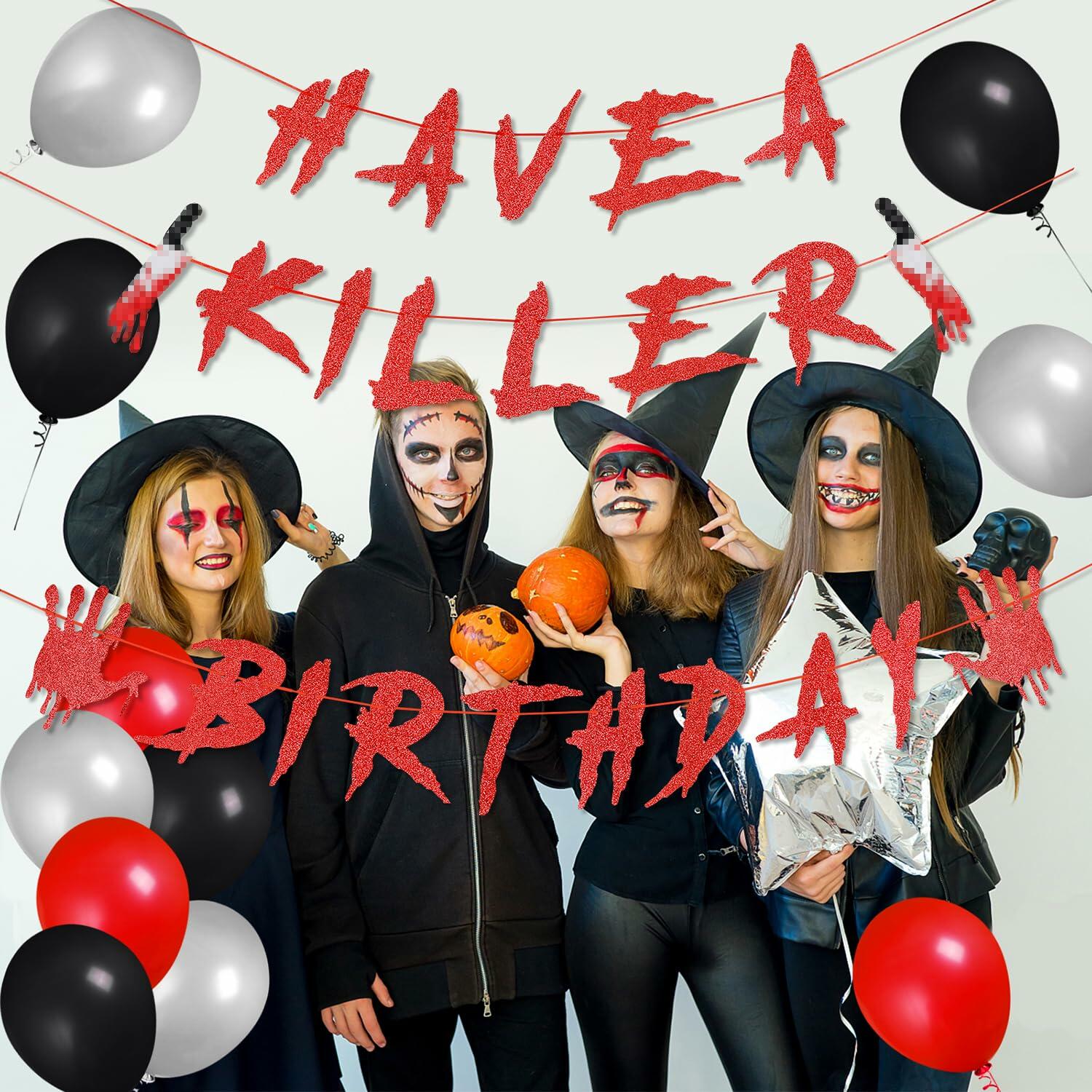 - What You Will Get: 1Pcs red glitter have a killer birthday banner, 1pcs red glitter have a killer birthday cake topper and 15pcs red black silver balloons,full of Halloween horror feeling.It is a must-have garland to celebrate your spooky Halloween birthday party, brighten up your home party.