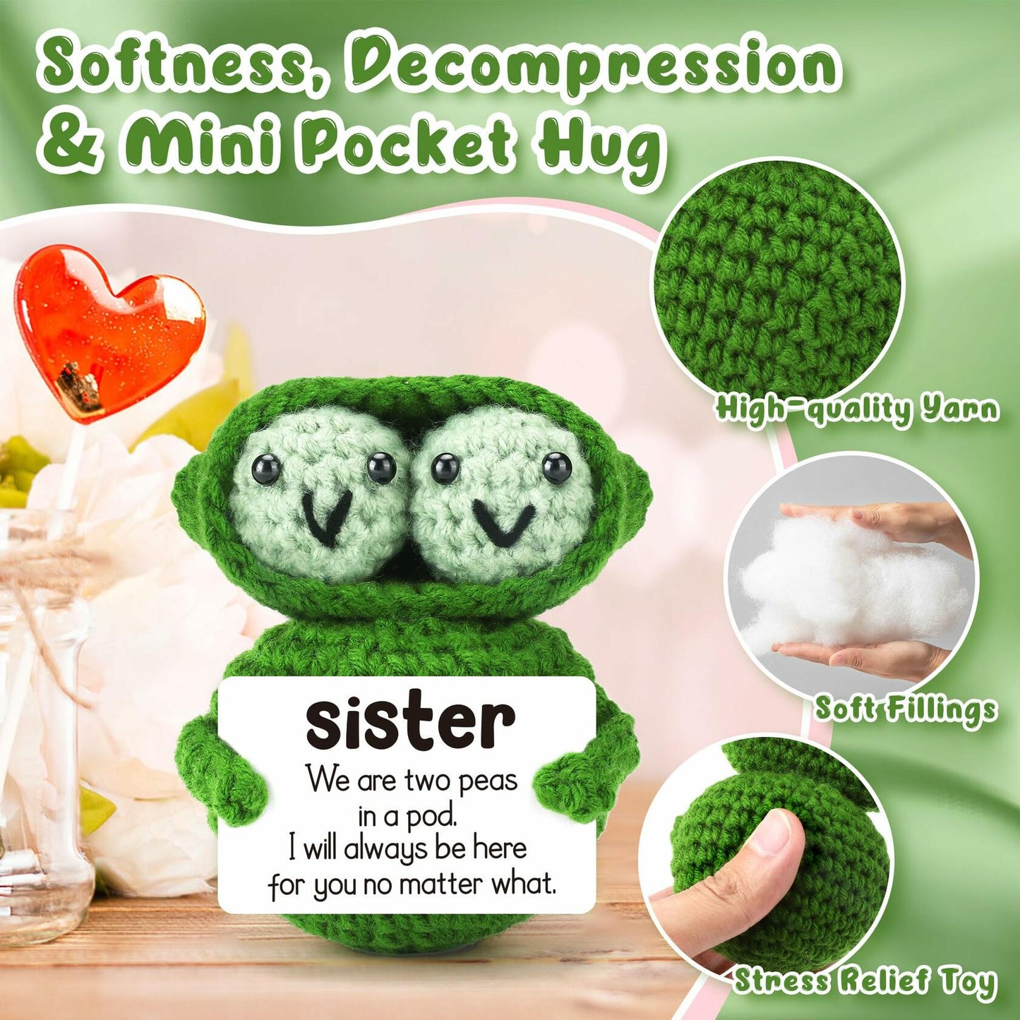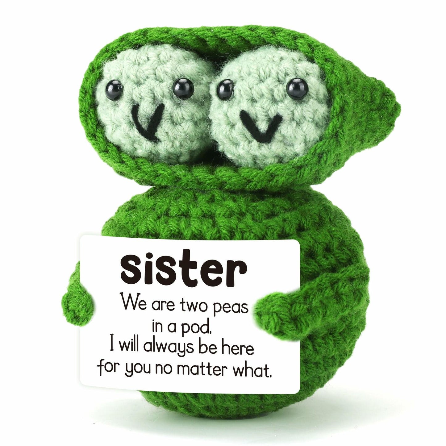- Long Distance Friendship Gifts: This mini crochet handmade peas with heartfelt message card "Sister, We are two peas in a pod. I will always be here for you no matter what.", so sweet and relationship gifts for women or sister or best friends; These funny female friendship gifts are very suitable for expressing that you wish to be closer to her in both body and spirit
