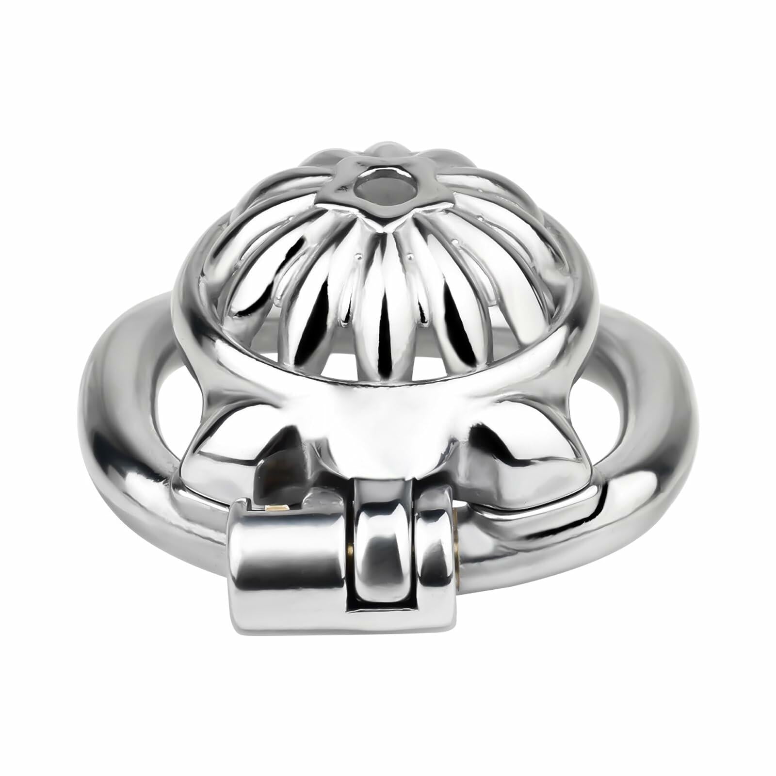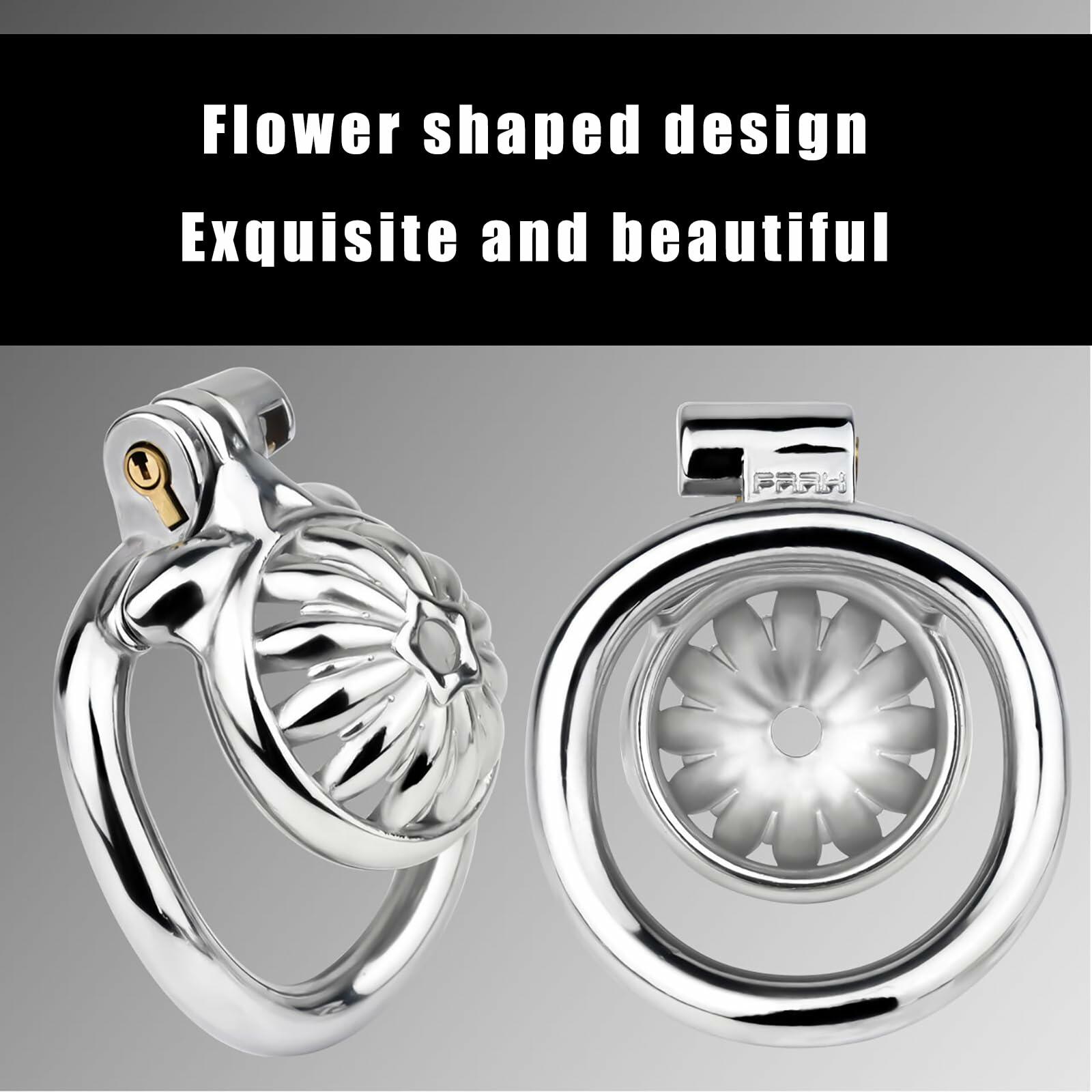 - Stainless Steel Construction: Crafted from high-polish stainless steel, this chastity cage is smooth and body-safe. The surface of the cage is in the beautiful shape of a flower. The bondage gear ensures durability, while the weighted cock ring base provides a secure fit