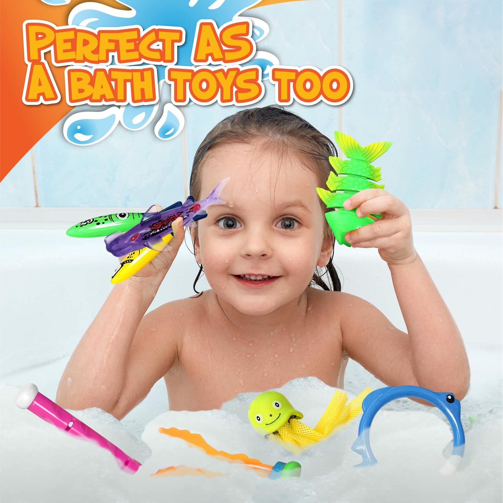 - YOUR KID’S FAVORITE POOL ACCESSORIES: Our sinking pool toys will make a great addition to your swimming pool accessories for kids. The pool dive toys come with a storage net bag, making them easily portable. You can carry them to the beach, pool or enjoy using them during bath time.