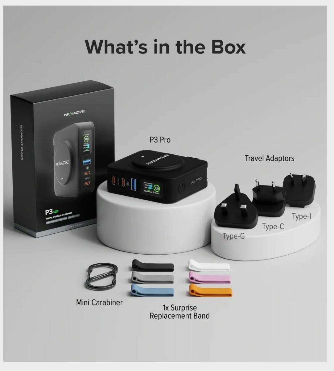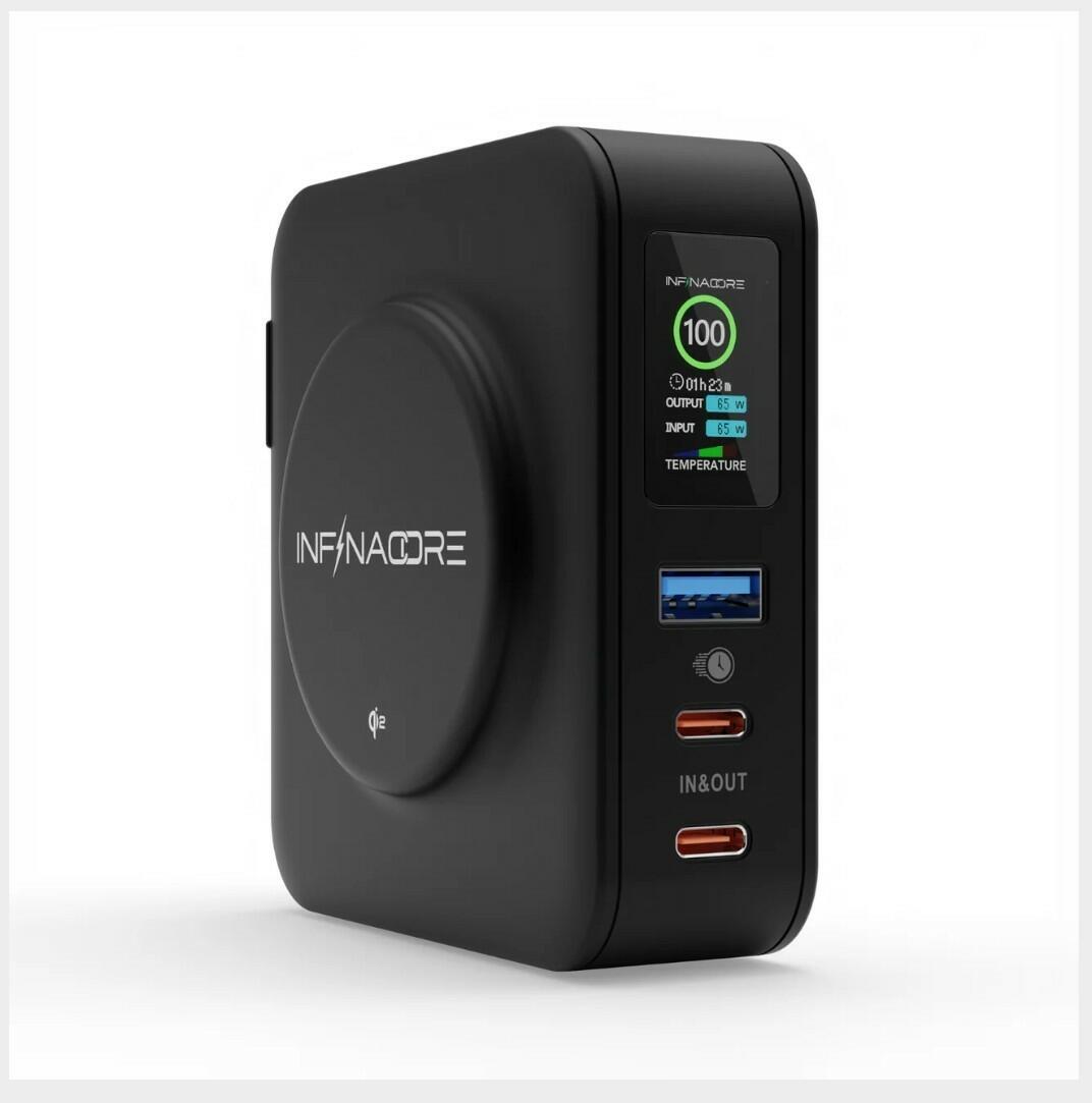 The InfinaCore P3 Pro is the ultimate 3-in-1 charging solution: a 65W GaN wall charger, a 10,500 mAh power bank, and a Qi2-certified wireless charging pad all in one compact, travel-ready unit. With global plug adapters and a digital OLED display, the P3 Pro keeps your phone, laptop, and accessories powered wherever you go.