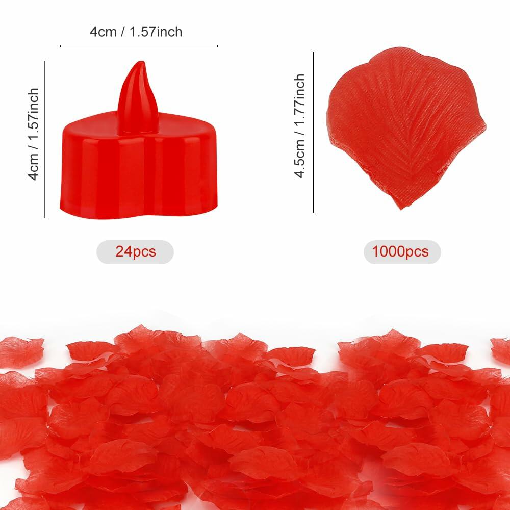 - 🎉Rose Petals and Candles Set Size🎉You will get 1000 pieces beautiful artificial fake rose petals and 24 pieces LED heart shape candles.(You receive it 10 packs of petals, please separated the petals to 1000pcs) We have white shell warm light and red shell warm light colors for you choose. Different colors meet the decoration needs of different people. The size of flower petal is approx. 1.7 x 2 inches/ 4.5 x 5 cm, the size of candle is approx. 1.5*1.5 inches/4 *4cm in diameter.