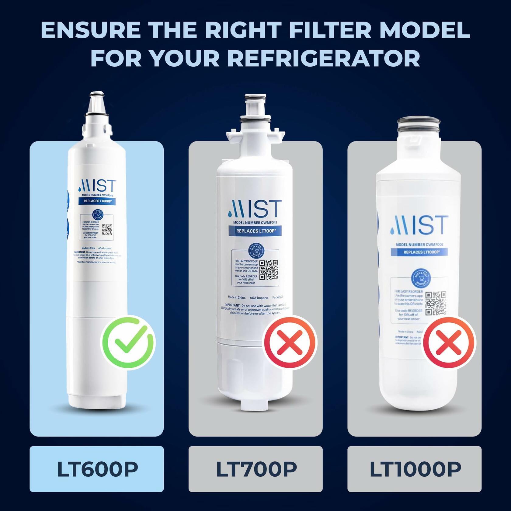 This high-performance Mist CWMF046 filter is a certified replacement for LG refrigerator filters LG LT600P, LG 5231JA2006A, LG 5231JA2006B, LG 5231JA2006F, LG 5231JA2005A, LG 5231JA2006E, LG LT600PC, LG LT600P-B, Kenmore 9990, Kenmore 46-9990, Kenmore 469990, Kenmore 9990P, Kenmore 4609990000, Insignia NS-LT600P, Sub-Zero 4204490, Sub-Zero 4290510, InSinkErator F-1000, InSinkErator F-2000. It is independently tested to NSF/ANSI 42 standards to reduce chlorine, odors, and contaminants, delivering cleaner, fresher-tasting water. Designed for a precise twist-lock fit and long-lasting performance.Compatible Refrigerator Models: