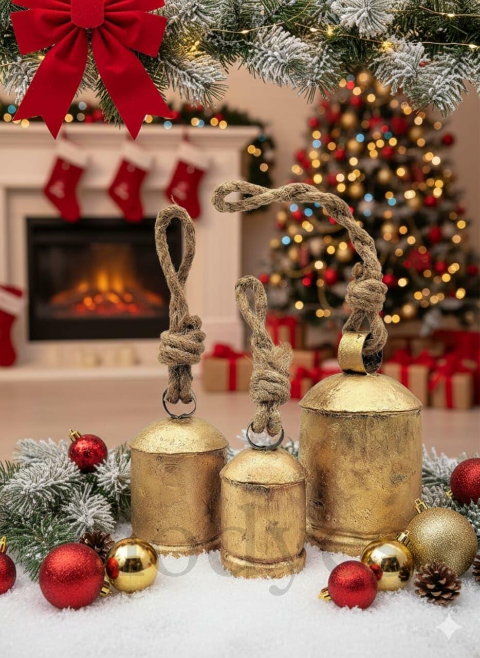 Add a touch of vintage elegance and soulful charm to your space with this Set of 3 Giant Harmony Decorative Bells. Crafted by skilled artisans, each bell features a rustic, antique finish and a sturdy jute rope for easy hanging. These oversized bells make a stunning statement whether hung on doors, entryways, patios, or used as Christmas decorations. Their soft, resonant chime brings peace and harmony, while the weathered metallic look fits beautifully into farmhouse, bohemian, and traditional decor themes.FEATURES