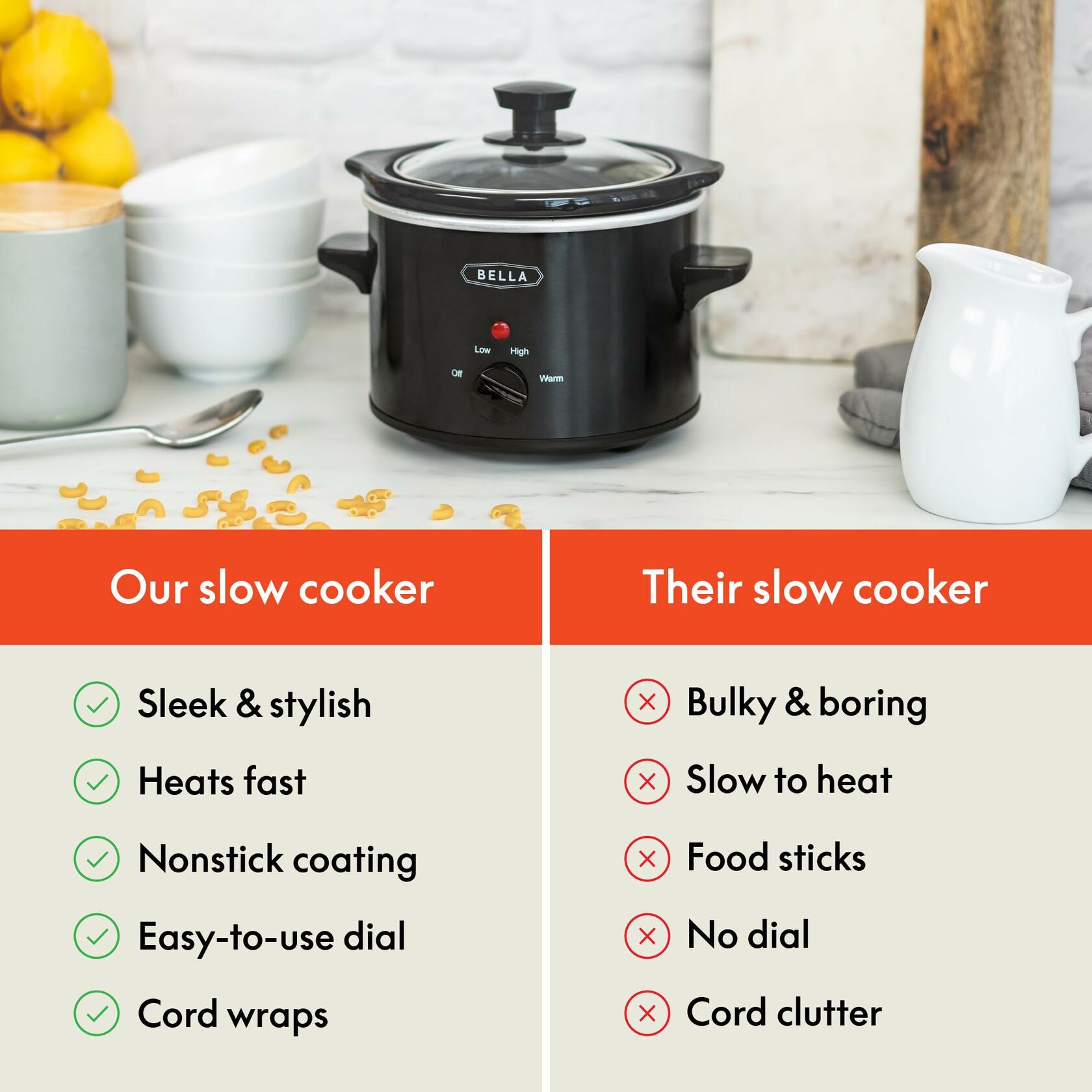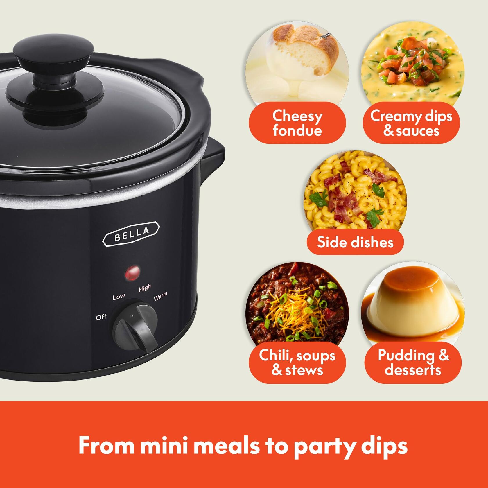- Perfectly Sized for Petite Options: Enjoy cooking small meals effortlessly with the BELLA 1.5qt slow cooker and mini crock pot. Its compact size is ideal for solo dining or cozy gatherings, making it a useful kitchen essential for many occasions