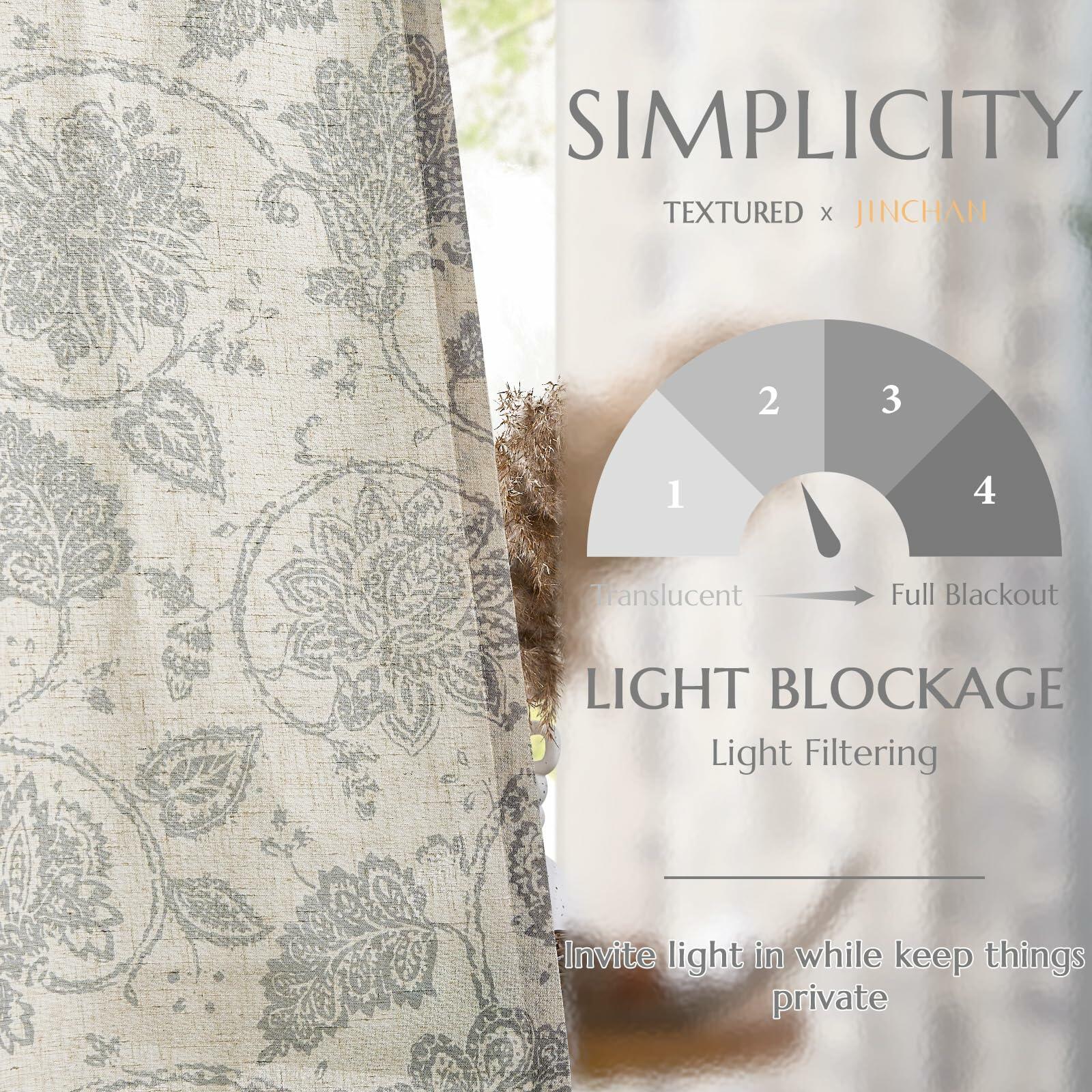- Ready Made: Package includes 2 panels in 50 inch wide by 63 inch long each, 100 by 63 combined. These linen blend back tab curtains adds a botanical art to your windows. Warm up your space with the natural look and feel of JINCHAN curtains.