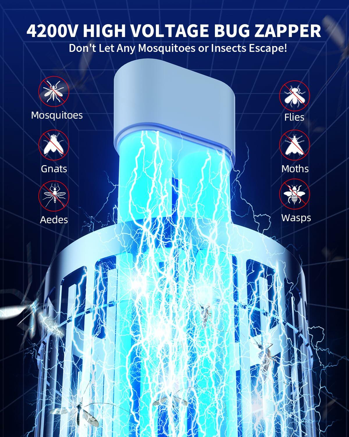- 【Efficient Mosquito Zapper】Equipped with 15W UV light bulb and 4200V high-voltage grid, The 15W UV light can attract mosquitoes from over 2100 square feet away, and the 4200V high-voltage grid effectively eliminates mosquitoes, leaving them with nowhere to escape