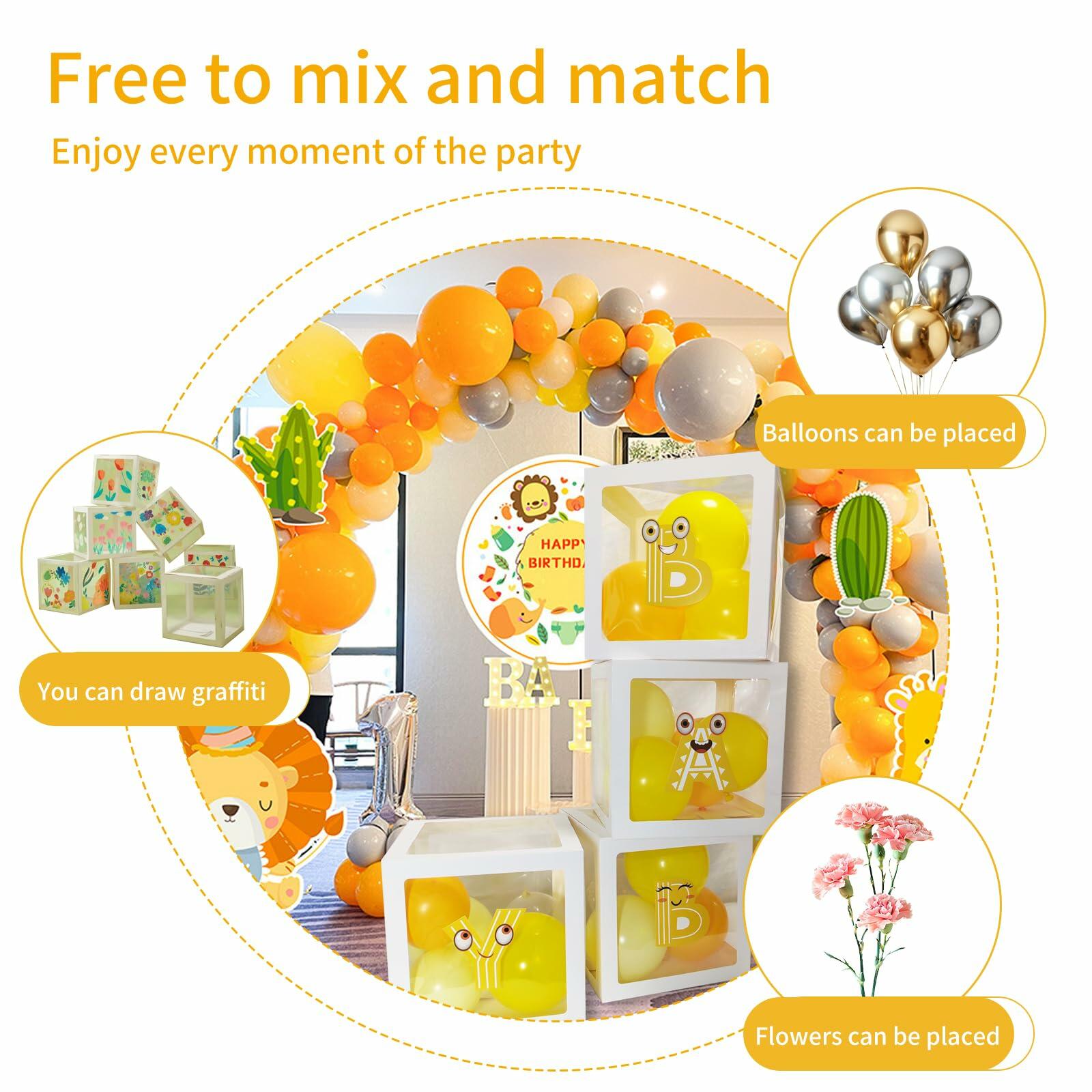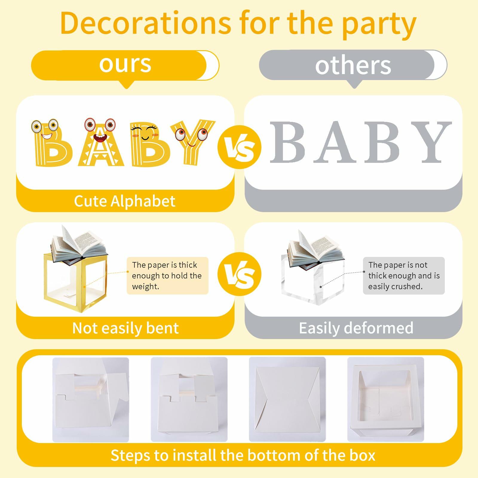 4 transparent balloon boxes with BABY letters.Whether it's a baby shower, birthday celebration, wedding party, or a stylish photography backdrop, these boxes are the perfect addition to any occasion.After the event, they can be repurposed as nursery decor or used for future celebrations, making them a sustainable and cost-effective option.